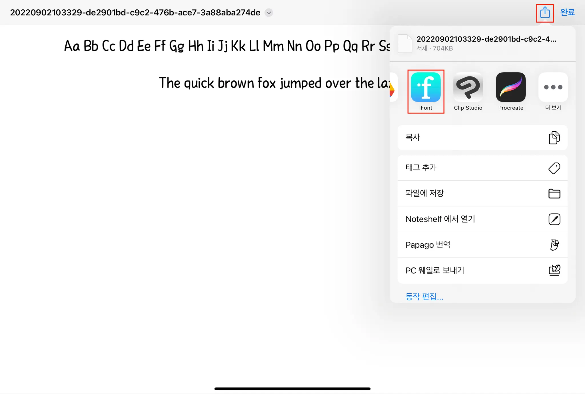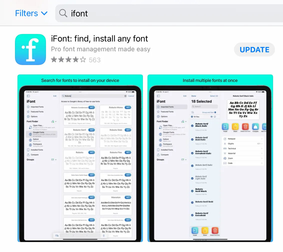 From Library, select the font you would like to install, tap Open in Another App, then select iFont.