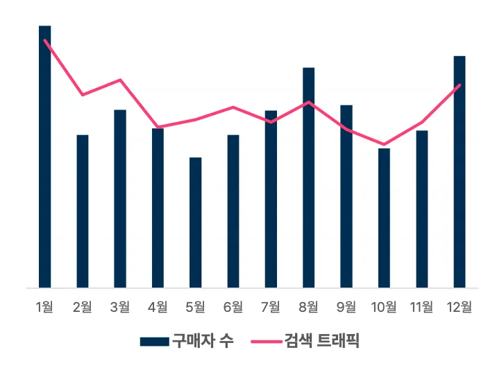 새해가 오면 꼭 사야하는 다이어리, 그렇기 때문에 12월부터 검색량, 트래픽, 판매량이 늘어나고 이는 1월에 정점을 찍어요! 12월 초에는 2025년 상품을 제작하여 판매를 시작하면 베스트지만, 이 타이밍을 놓쳤다면 적어도 1월에는 상품을 업로드 해주시는 것이 더욱 좋아요!