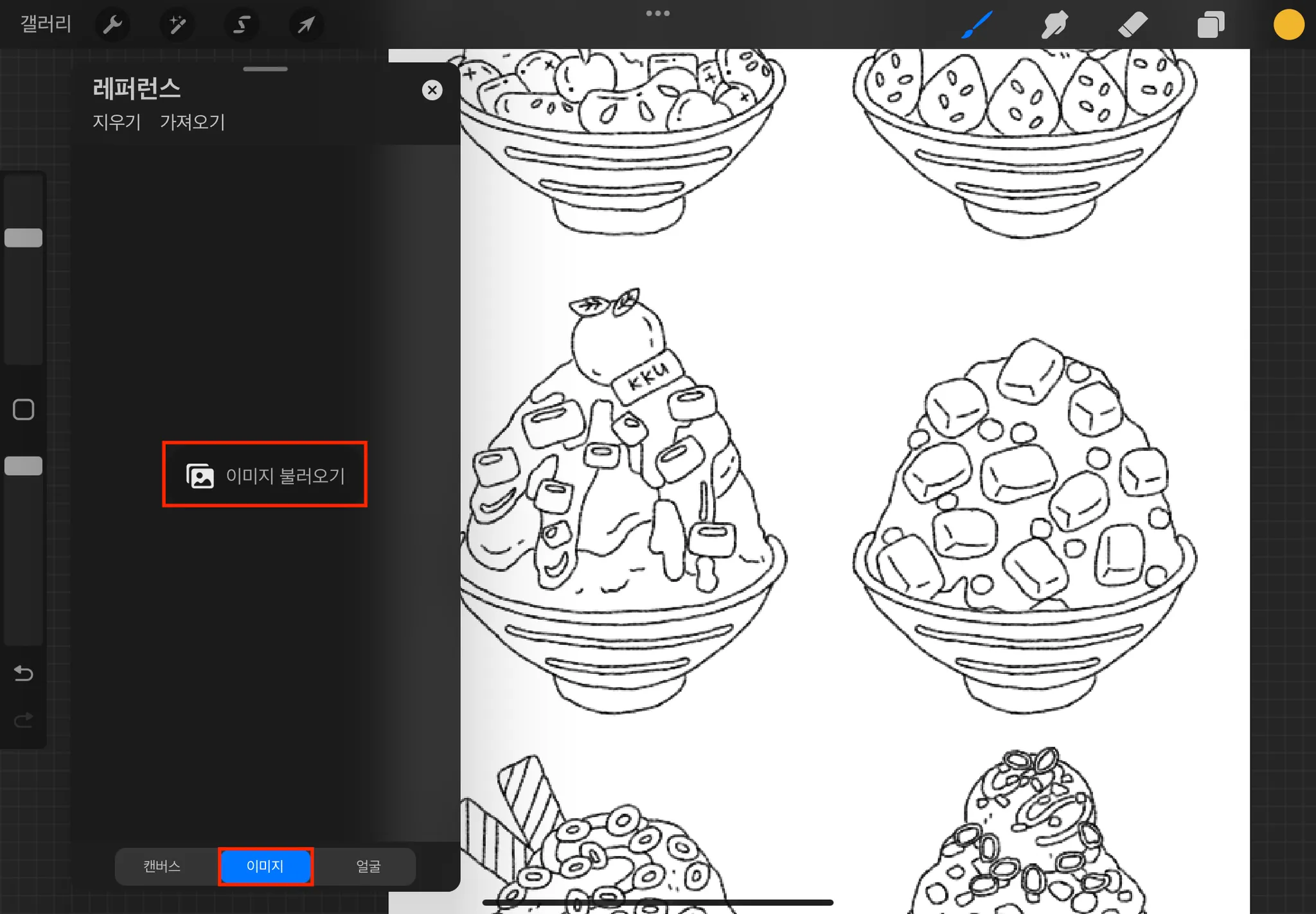 [레퍼런스] 창이 활성화 되면 [가져오기], [이미지 불러오기]로 파일 및 갤러리 앱에 있는 컬러스워치 이미지를 가져올 수 있어요.