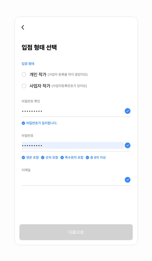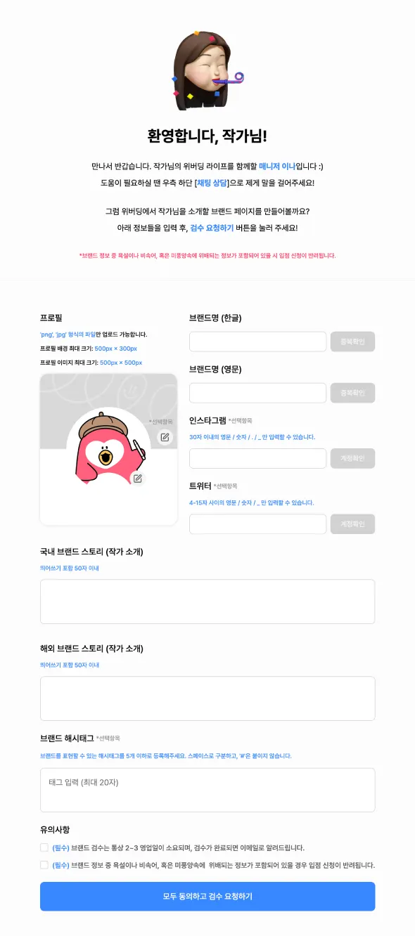 위버딩 작가로 입점하기 위한 정보들(아이디, 비밀번호, 입점 형태, 계좌 등)을 입력해주세요!