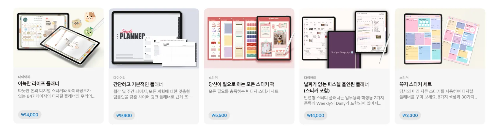 위버딩 작가님들의 작품이 굿노트 마켓에 입점된 모습