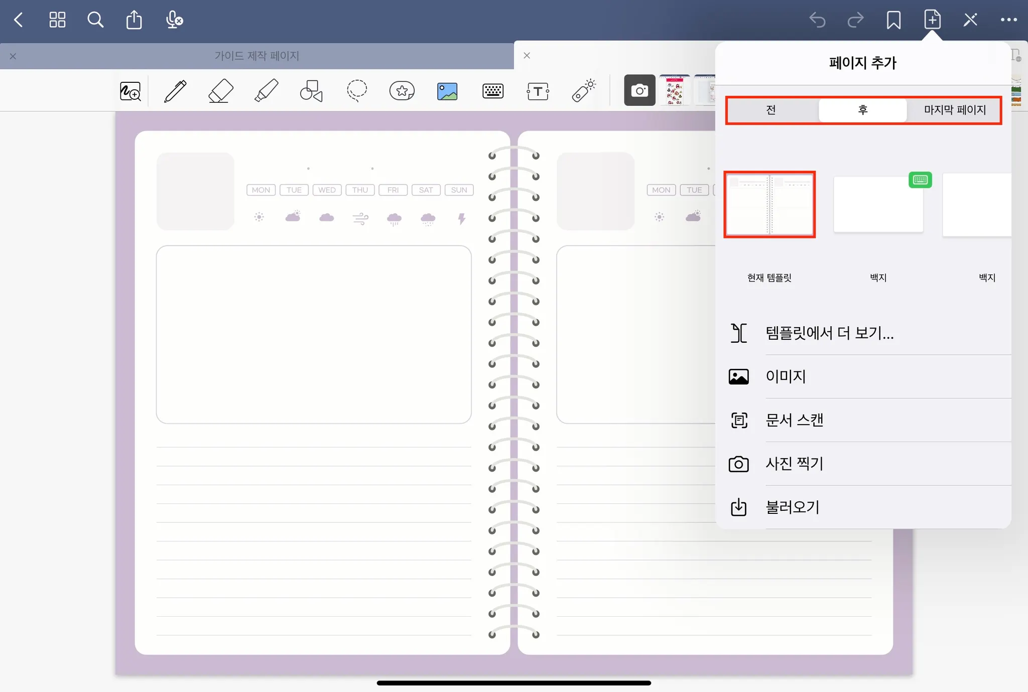 상단에서 페이지 추가를 앞, 뒤, 마지막에 할 것인지 설정할 수 있어요.