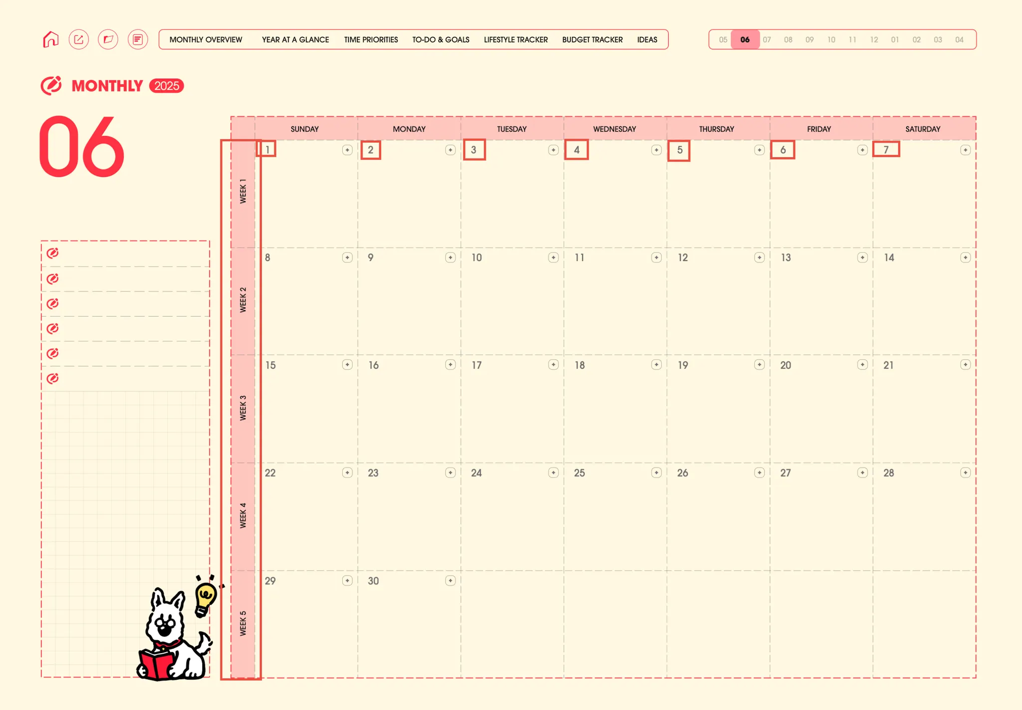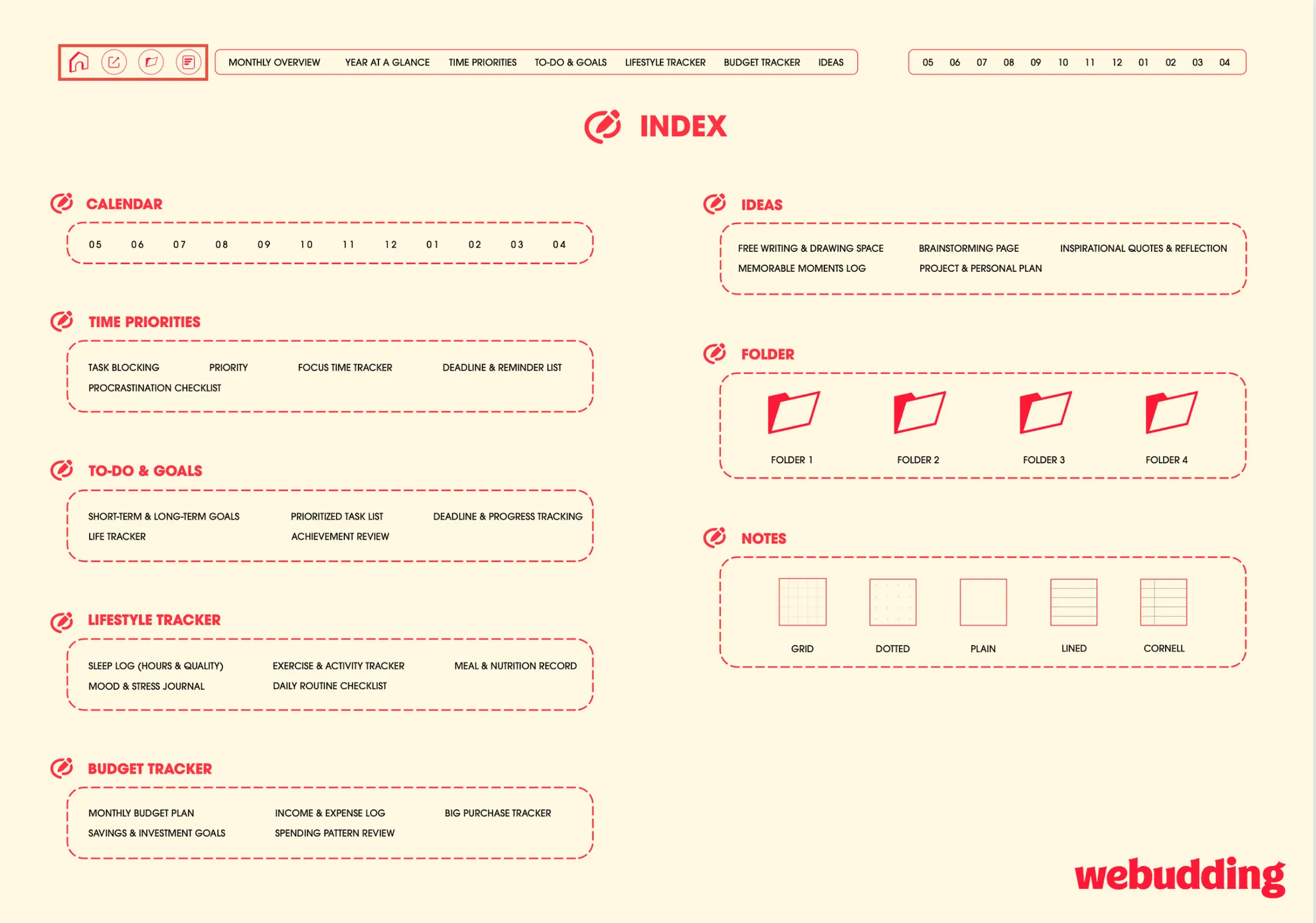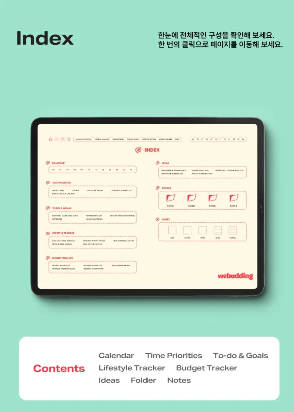 2. 대부분의 상품에서 숫자는 해당하는 월간, 주간, 또는 일간 페이지로 연결되며, 텍스트는 플래너 내의 해당 템플릿으로 연결됩니다.