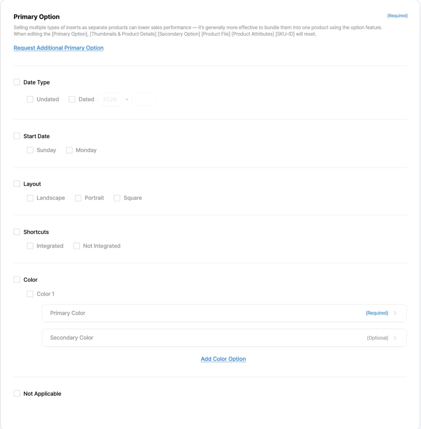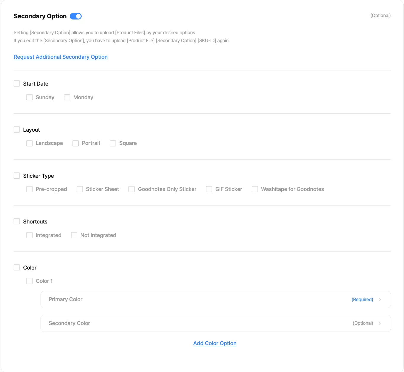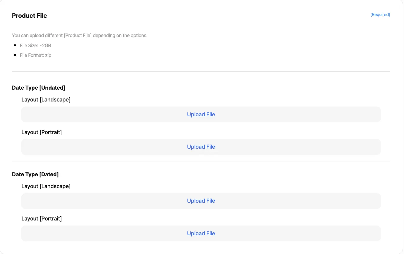 For example, if you select 'Portrait' and 'Landscape' for 'Layout' and 'Black' and 'White' for 'Color' in the Primary Option, you can upload 2X2 = 4 product files.