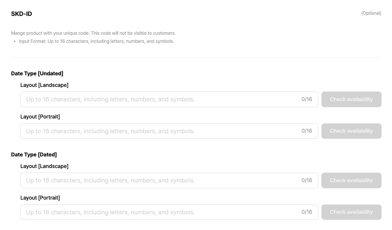 For example, if you select 'Landscape' and 'Portrait' in the Primary Option, and 'Black' and 'White' in the Secondary Option, you can create a total of 2X2=4 SKU codes. |