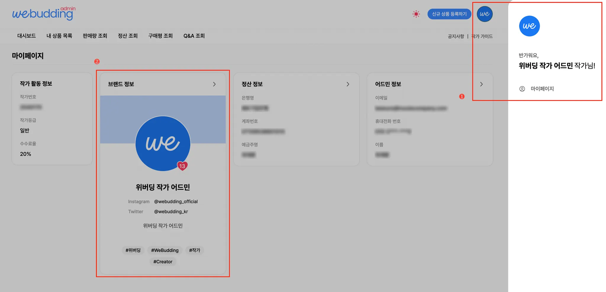 마이페이지 상단 프로필 클릭 → ❶‘마이페이지’ 클릭 → ❷‘브랜드 정보’ 클릭