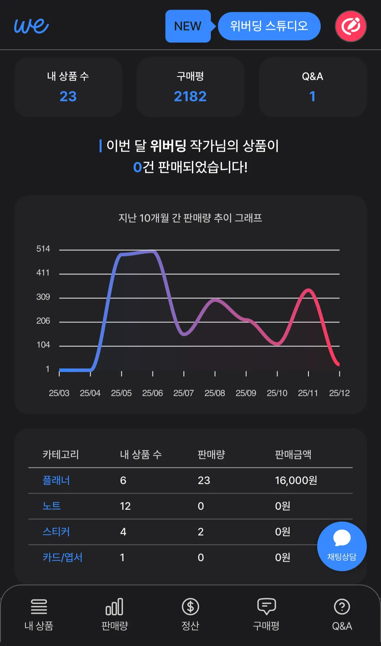 상품 정보 : 카테고리별 ‘내 작품 수’, ‘월 기준 판매량(개수)’, ‘판매금액’을 집계해 확인해요.