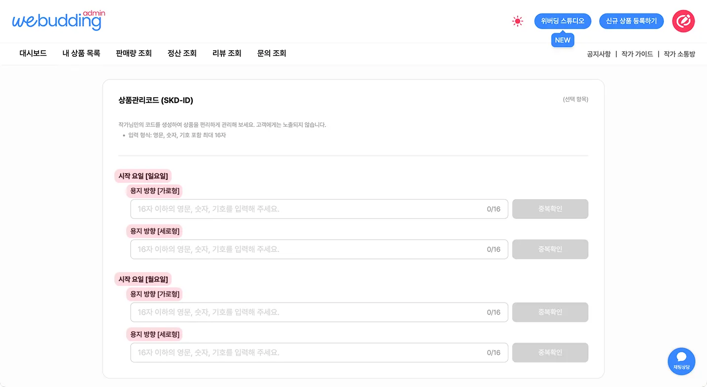 신규 상품 등록 과정에서 작가님의 상품 관리를 위한 [상품관리코드] 등록에 관한 안내입니다.