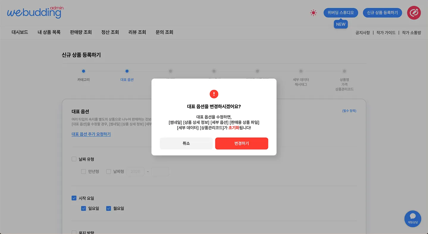 [대표 옵션]을 수정하면, 다음과 같은 정보들이 초기화됩니다.
