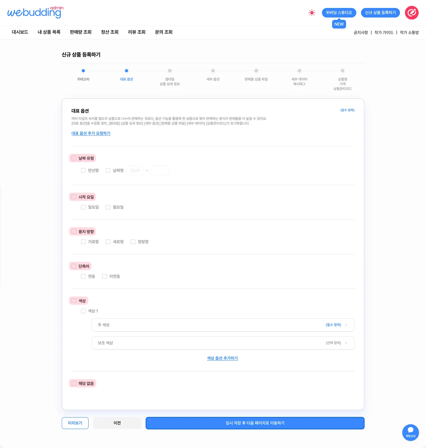 신규 상품 등록 과정에서 하나의 상품에 여러 옵션을 설정하고,