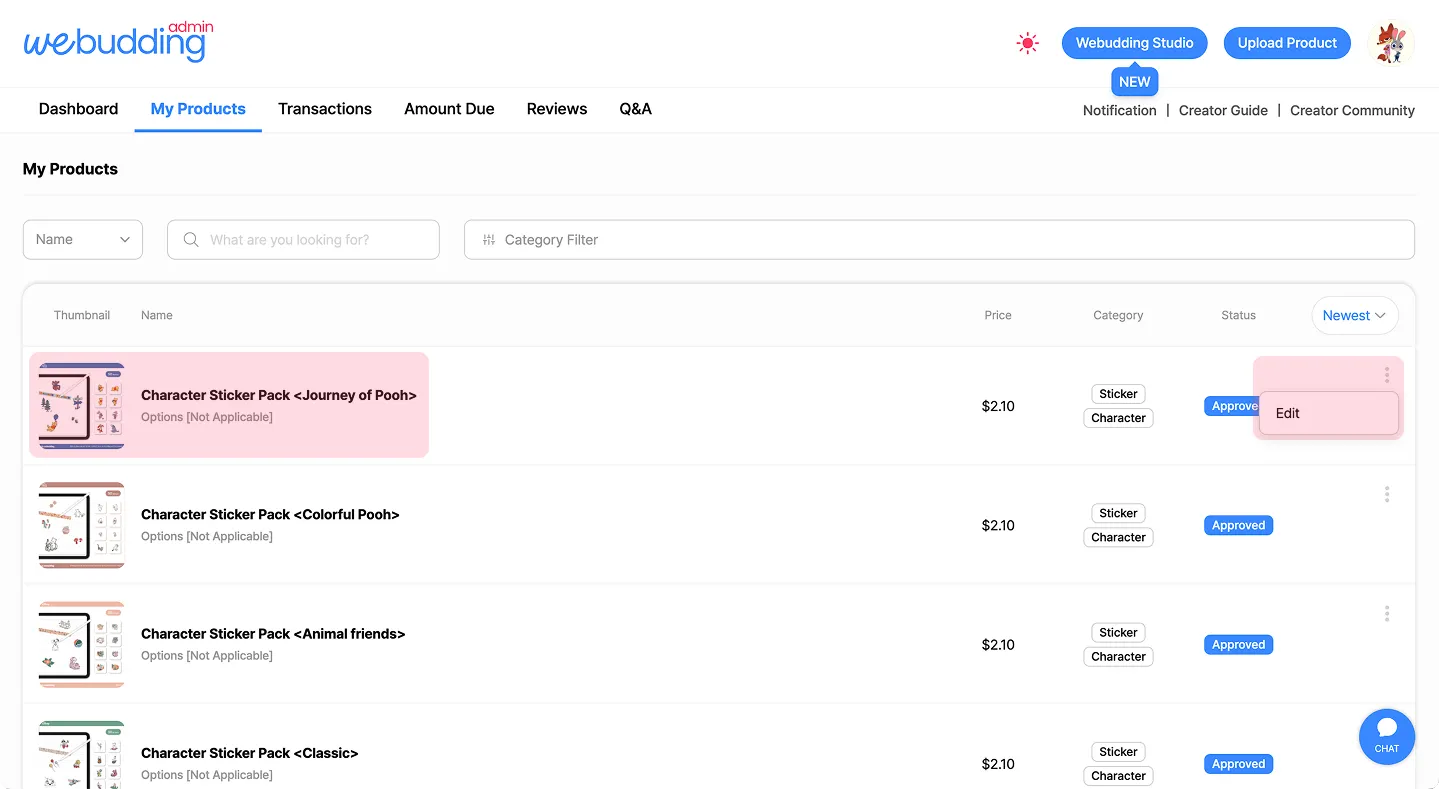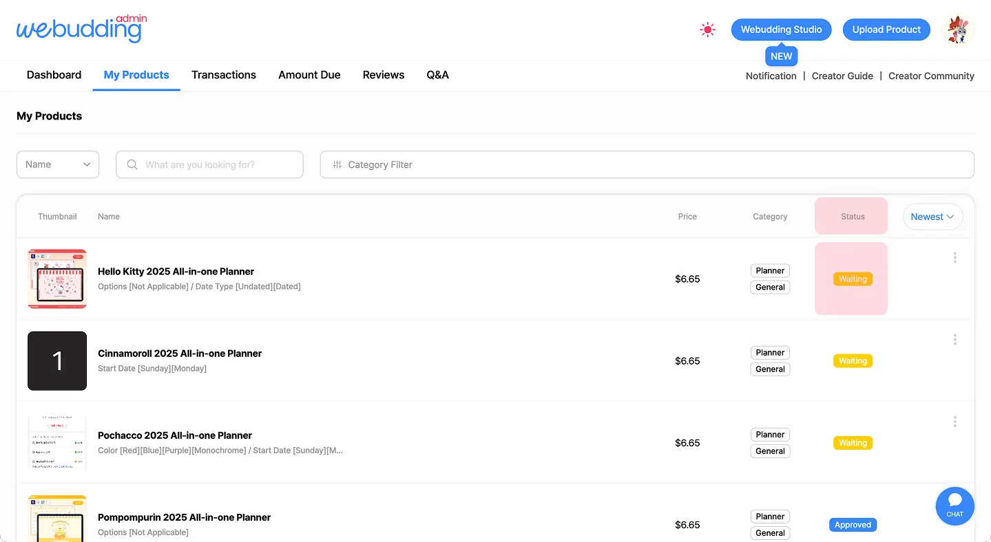 After the Webudding product management team reviews the product and finds no issues, the status will be updated to “Approved.”