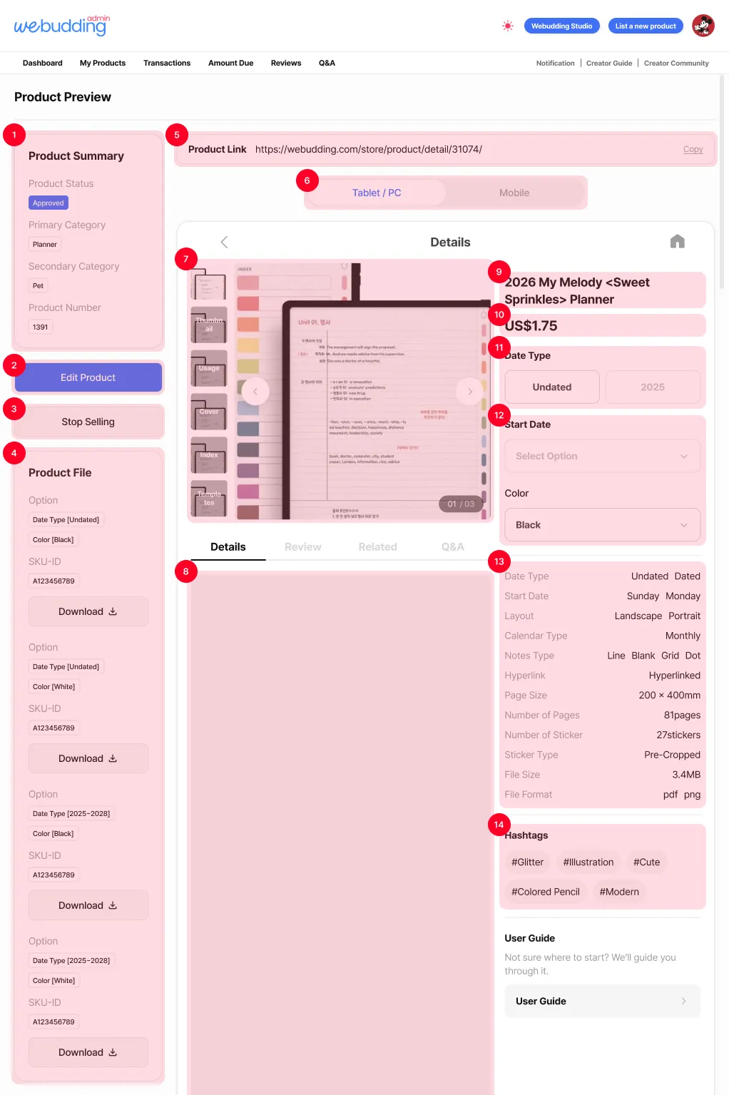 From [My Product List], click the thumbnail or product name to open the [Product Detail Preview] page.