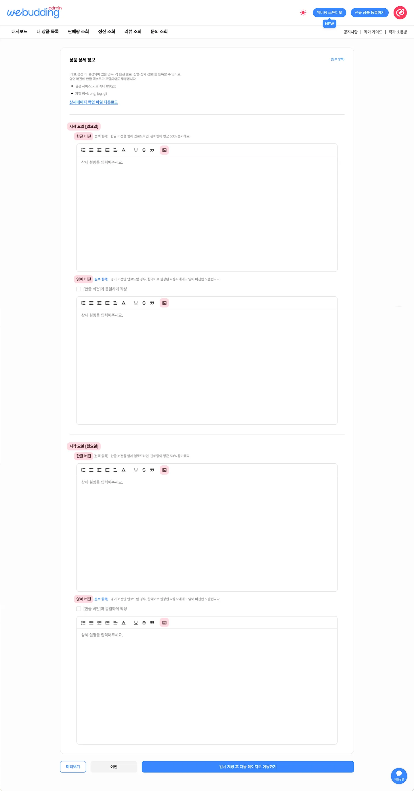 신규 상품 등록 과정에서 [상품 상세 정보] 입력 및 제작에 관한 안내입니다.