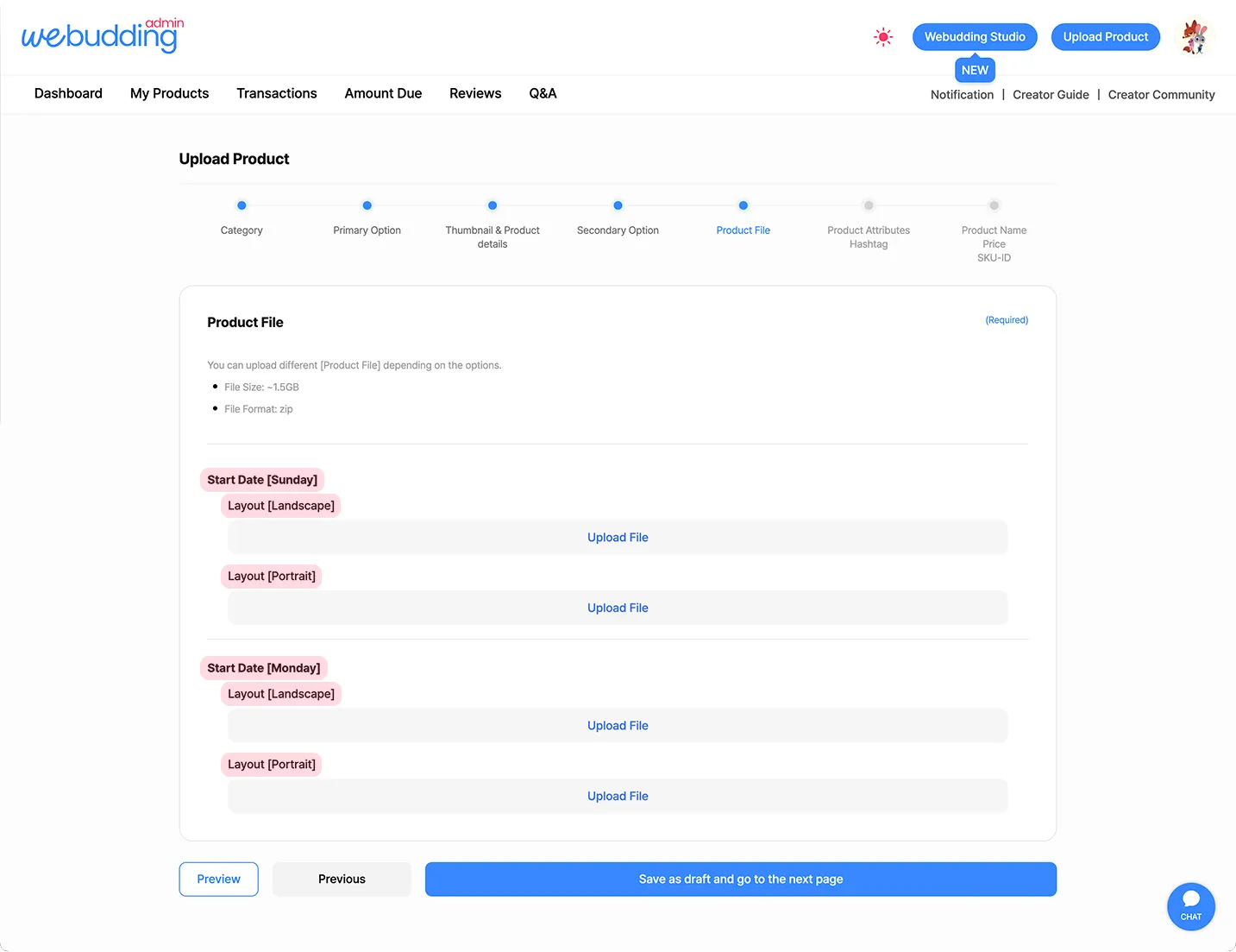 For example, if you select ‘Sunday’ and ‘Monday’ for ‘Start Date’ in the [Primary Options], and ‘Horizontal’ and ‘Vertical’ for ‘Page Orientation’ in the [Secondary Options], you can upload a total of 2 × 2 = 4 Product Files (‘Sunday–Horizontal’, ‘Sunday–Vertical’, ‘Monday–Horizontal’, ‘Monday–Vertical’).