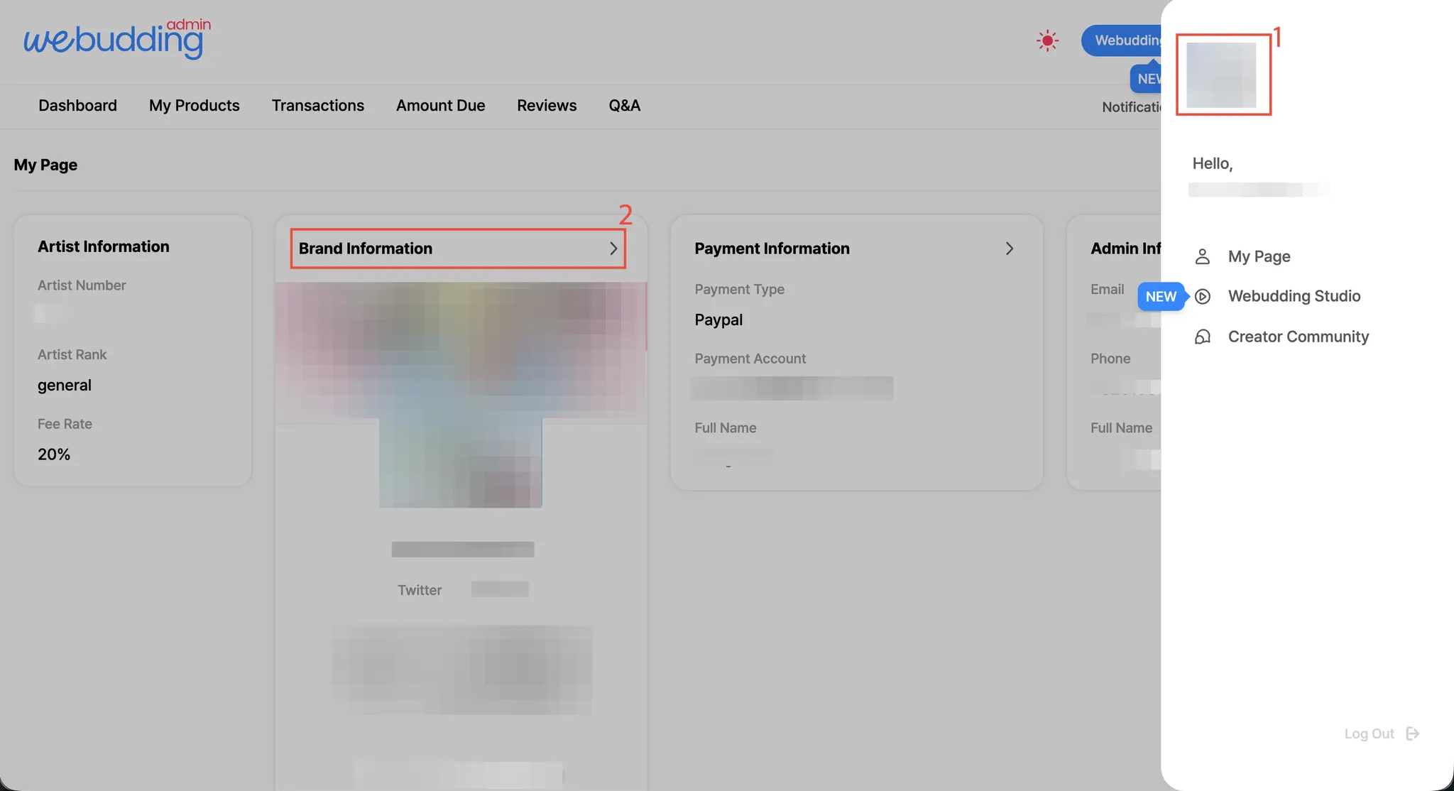 Click profile image on the top right → ❶ Click My page → ❷ Click Brand Information
