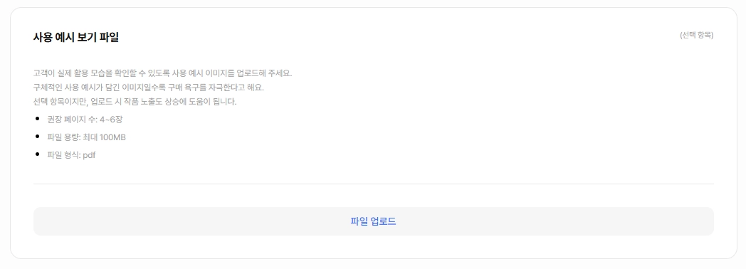 각 상품에 등록한 옵션의 수와 무관하게, 상품 당 1개의 사용 예시 보기 파일을 업로드할 수 있습니다.