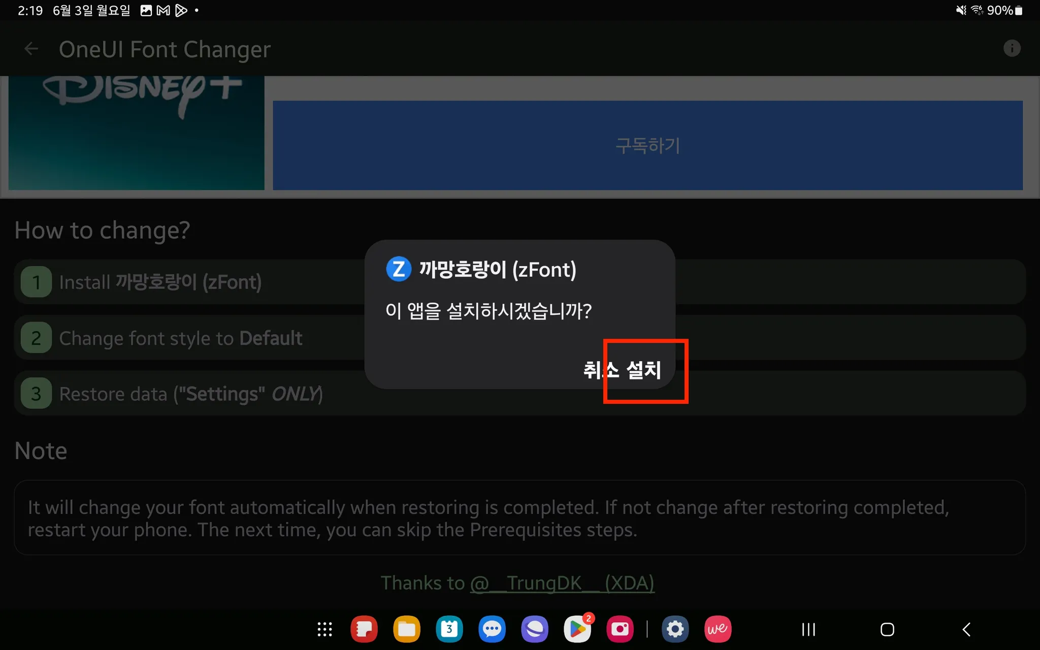 14. How to change? 에서 1번 [Install “다운폰트명” (zFont)] 클릭 → [설치] → [무시하고 설치하기] 클릭