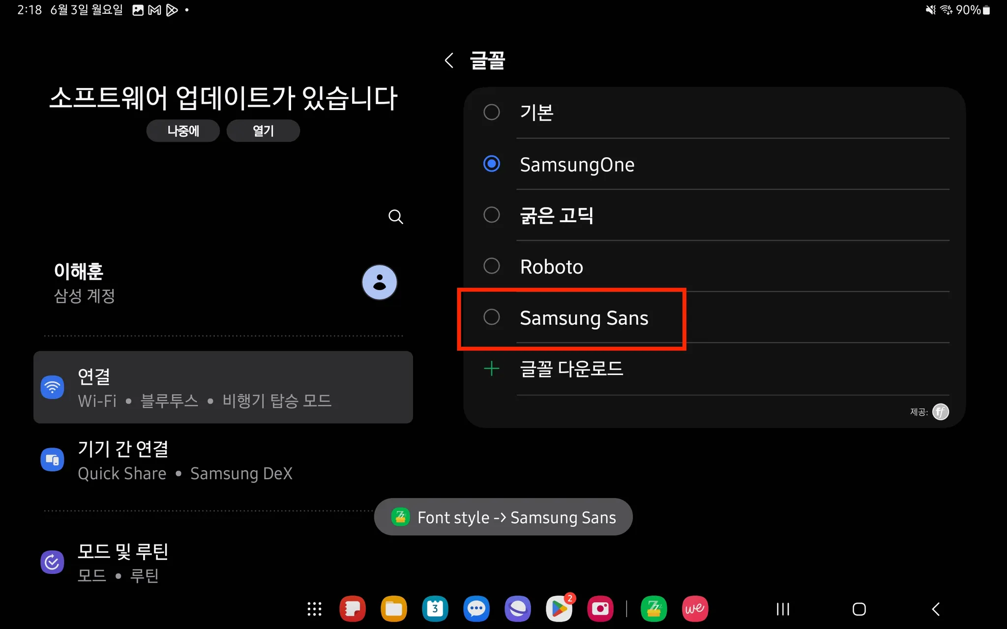 글꼴 스타일을 Samsung Sans 로 설정해 주세요.