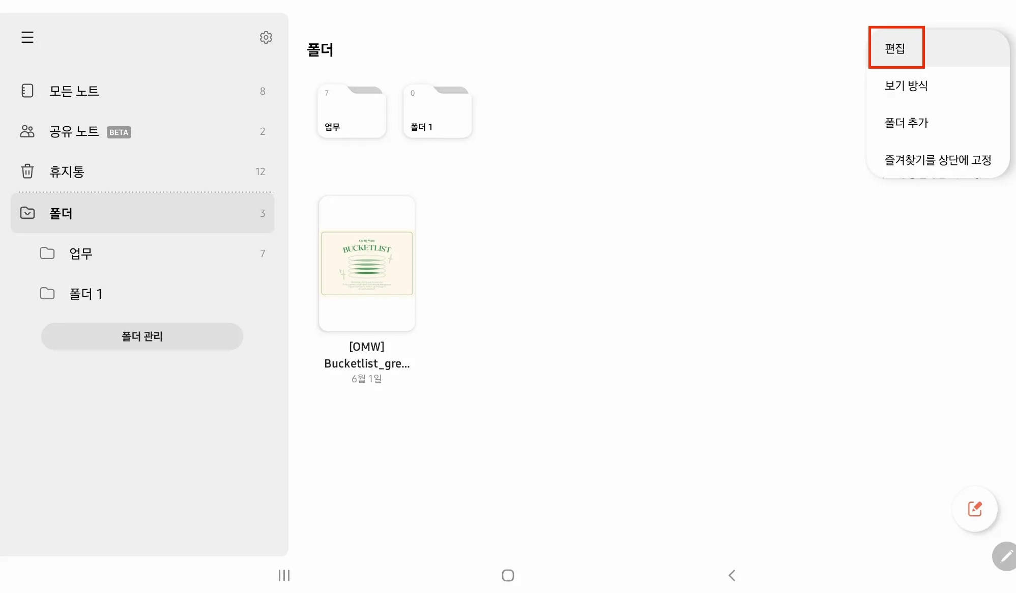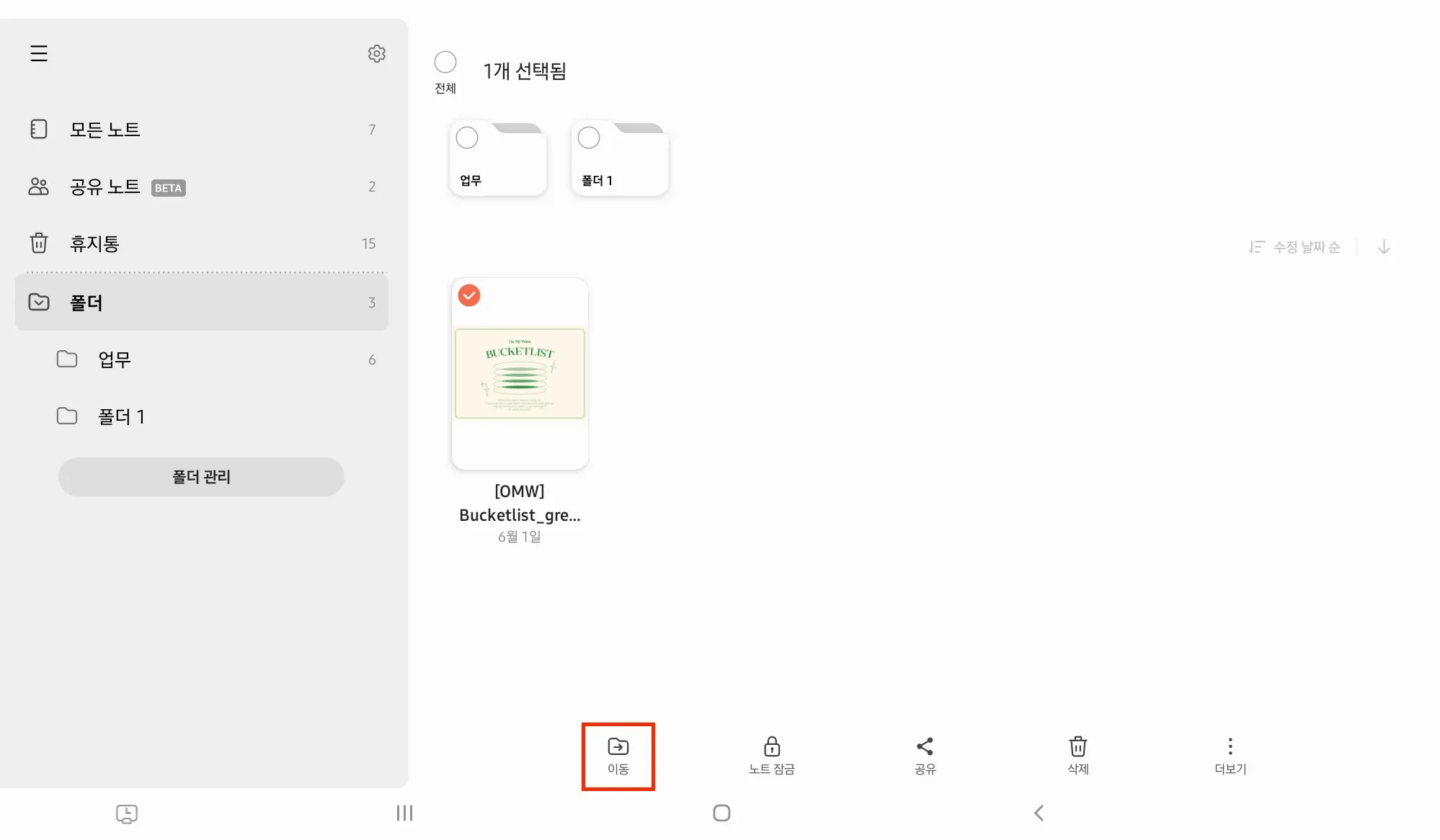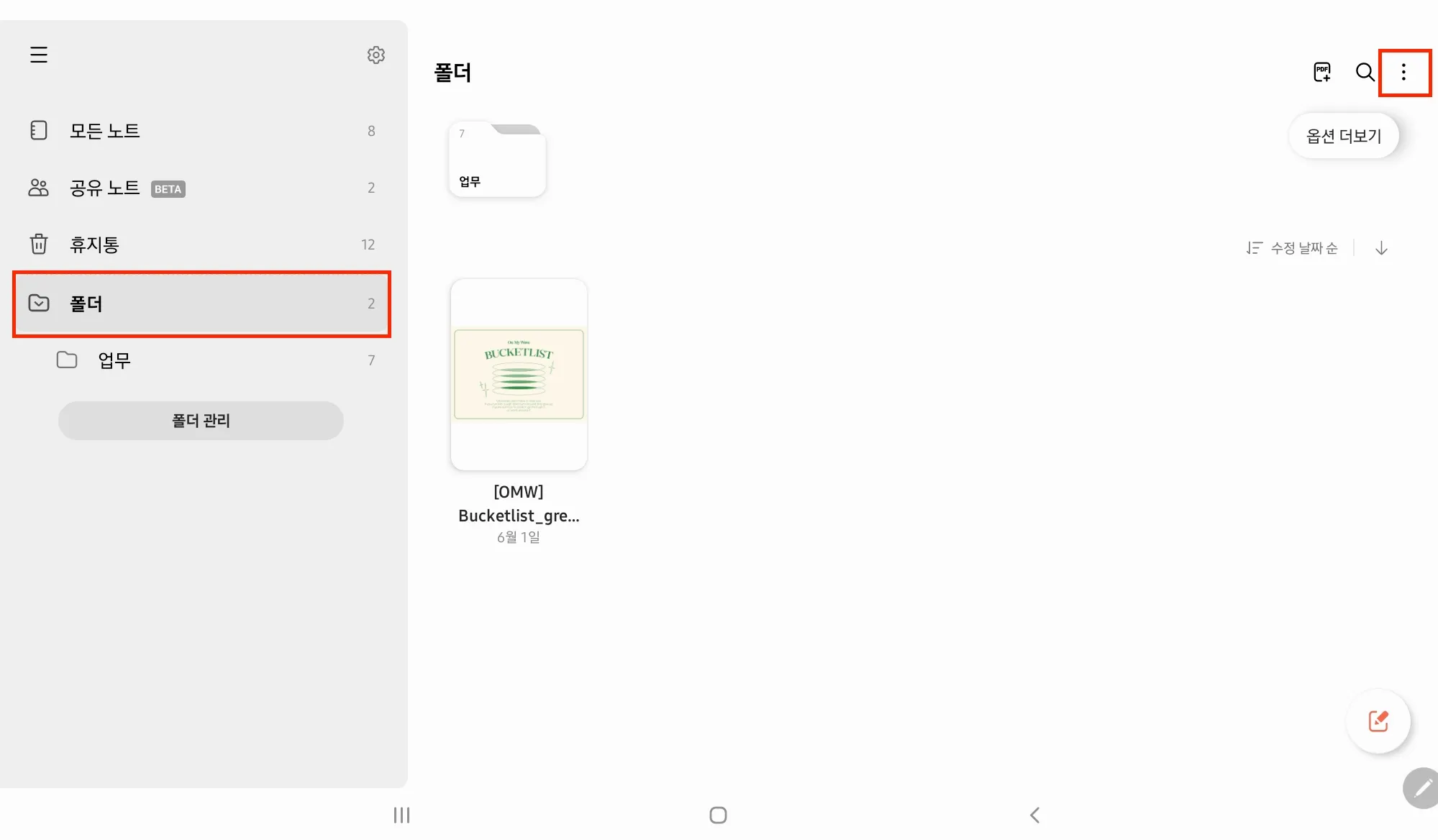 01. 오른쪽 상단 [옵션 더보기] 점 세개 클릭 → 편집 → 속지 선택 → 폴더 선택 → 이동