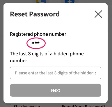 The phone number you filled in when joining our website will appear with the last three digits hidden. Please enter the last three digits that are hidden.