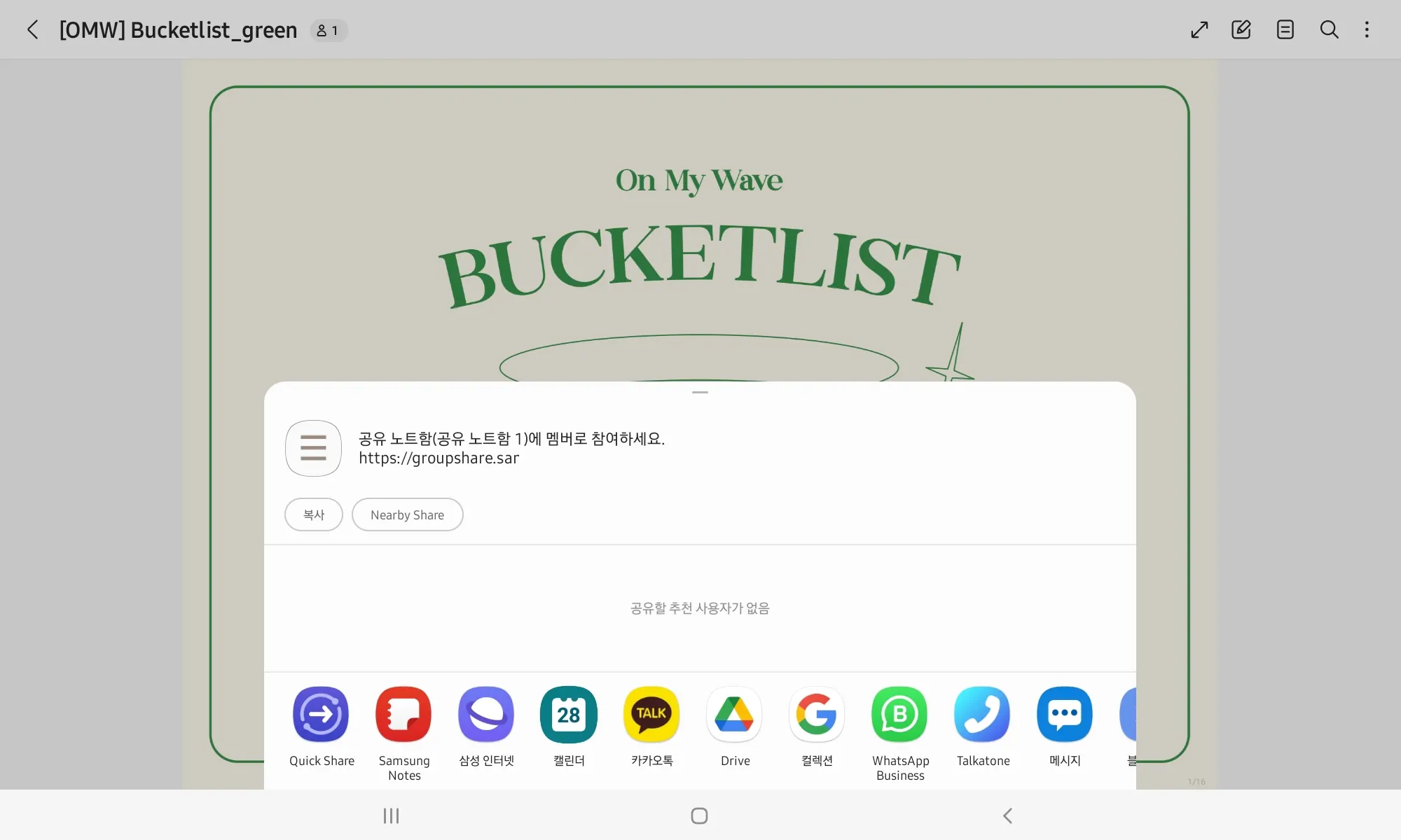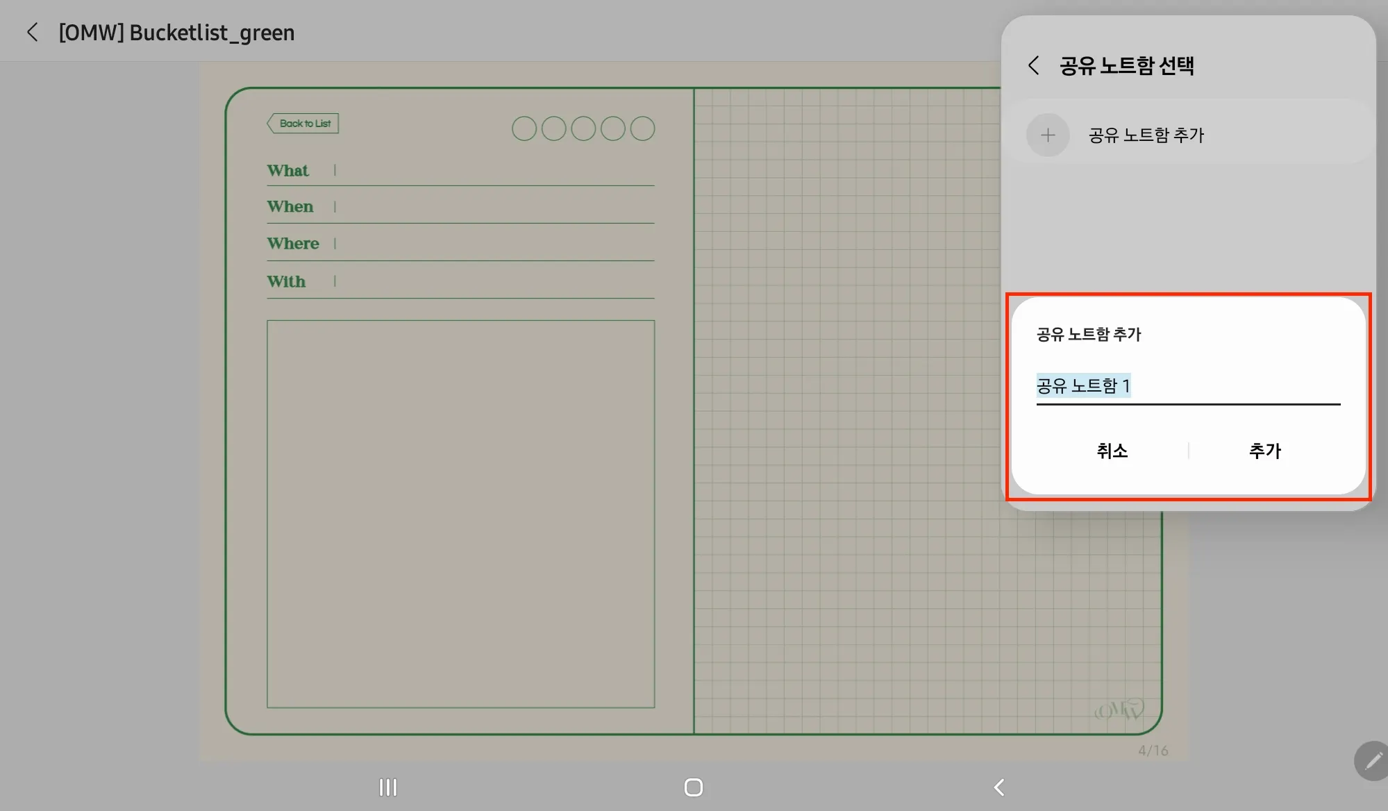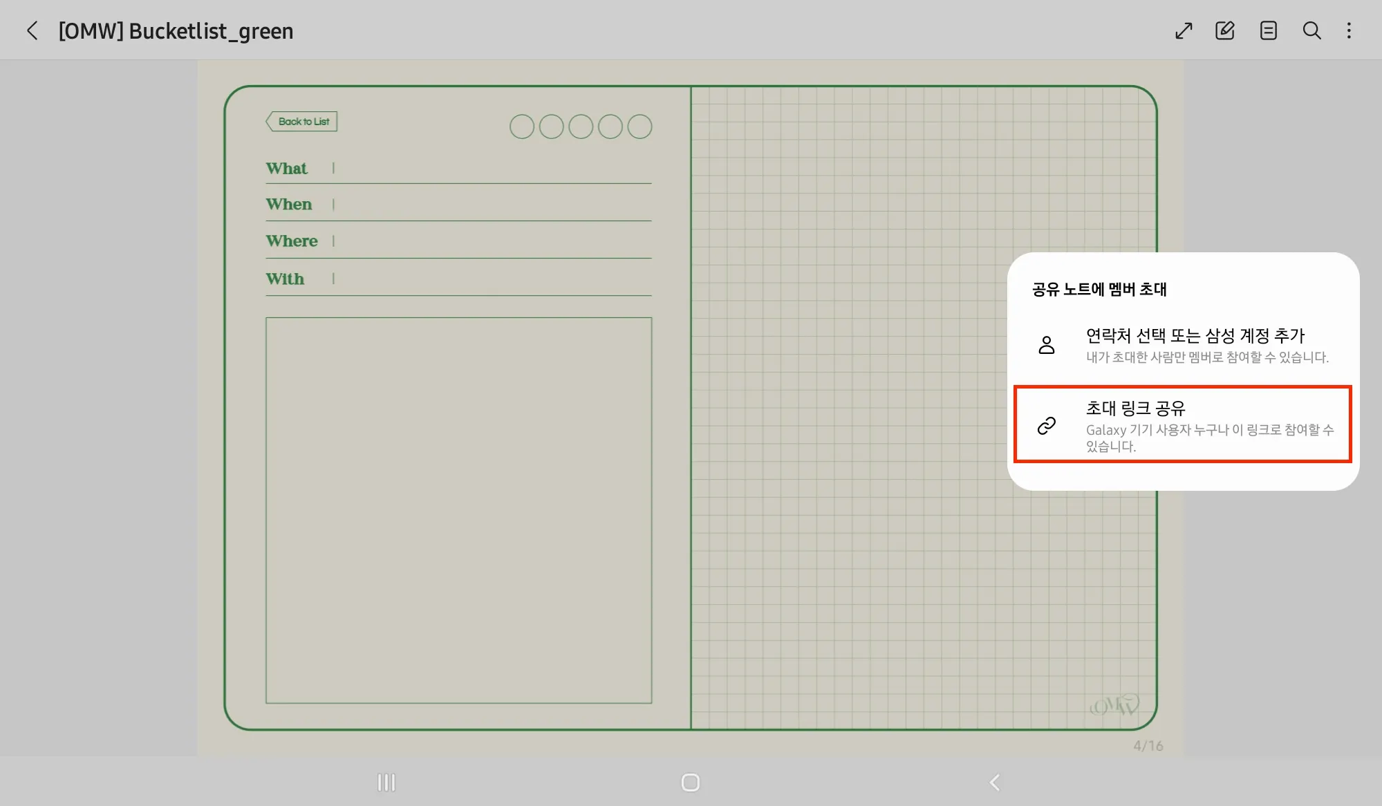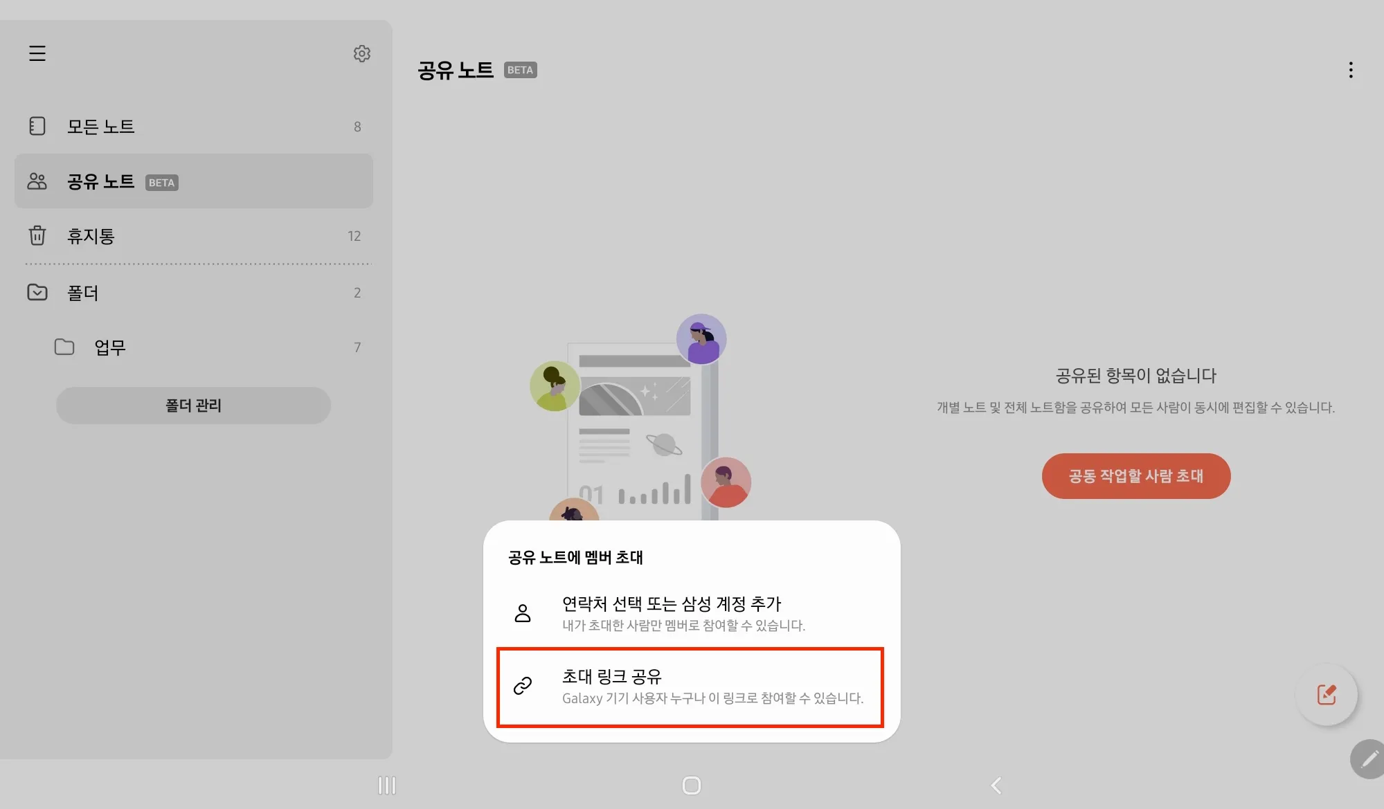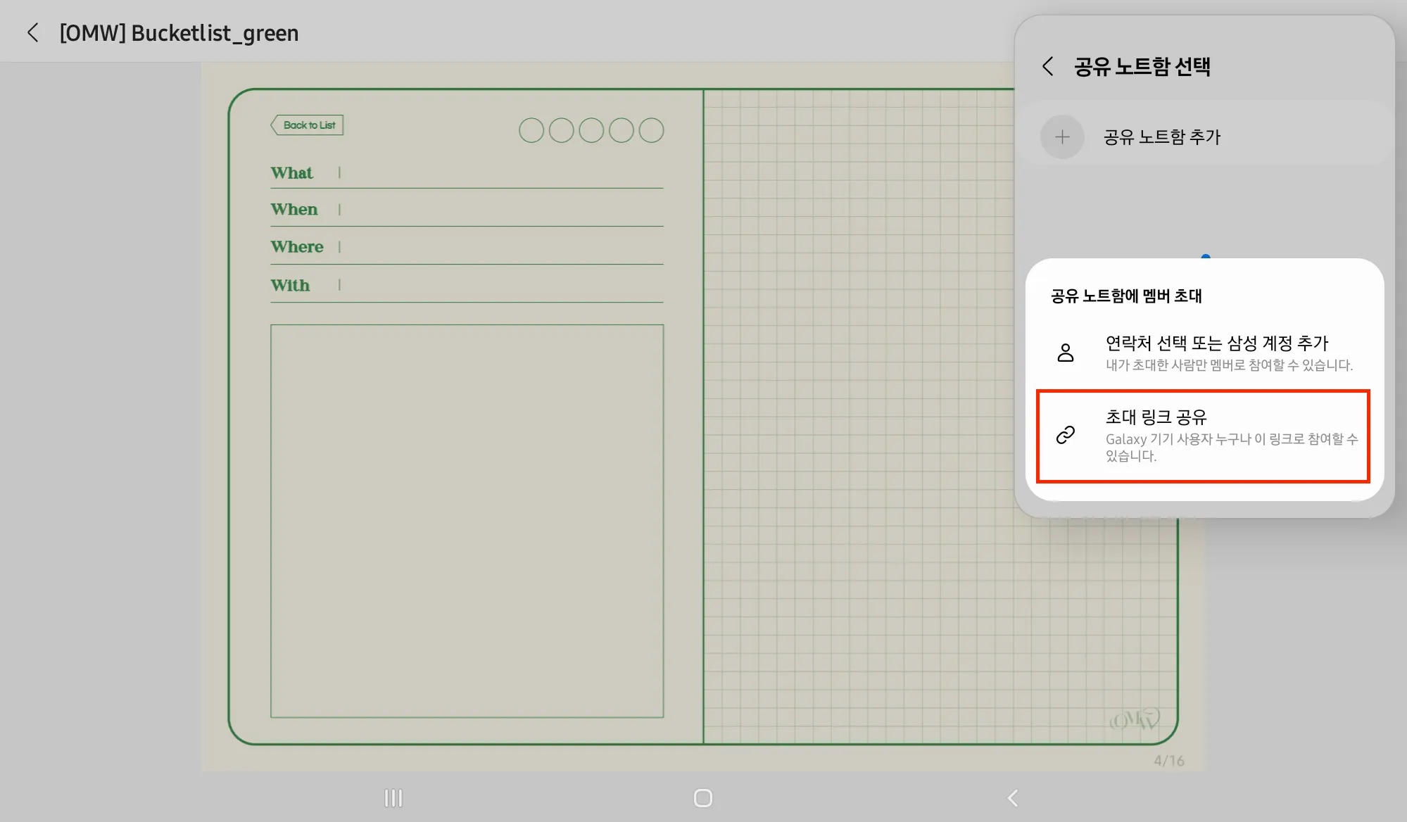 02. 공유 노트함에 추가 → 초대 링크 공유 or 연락처 선택 및 계정 추가 → 공유