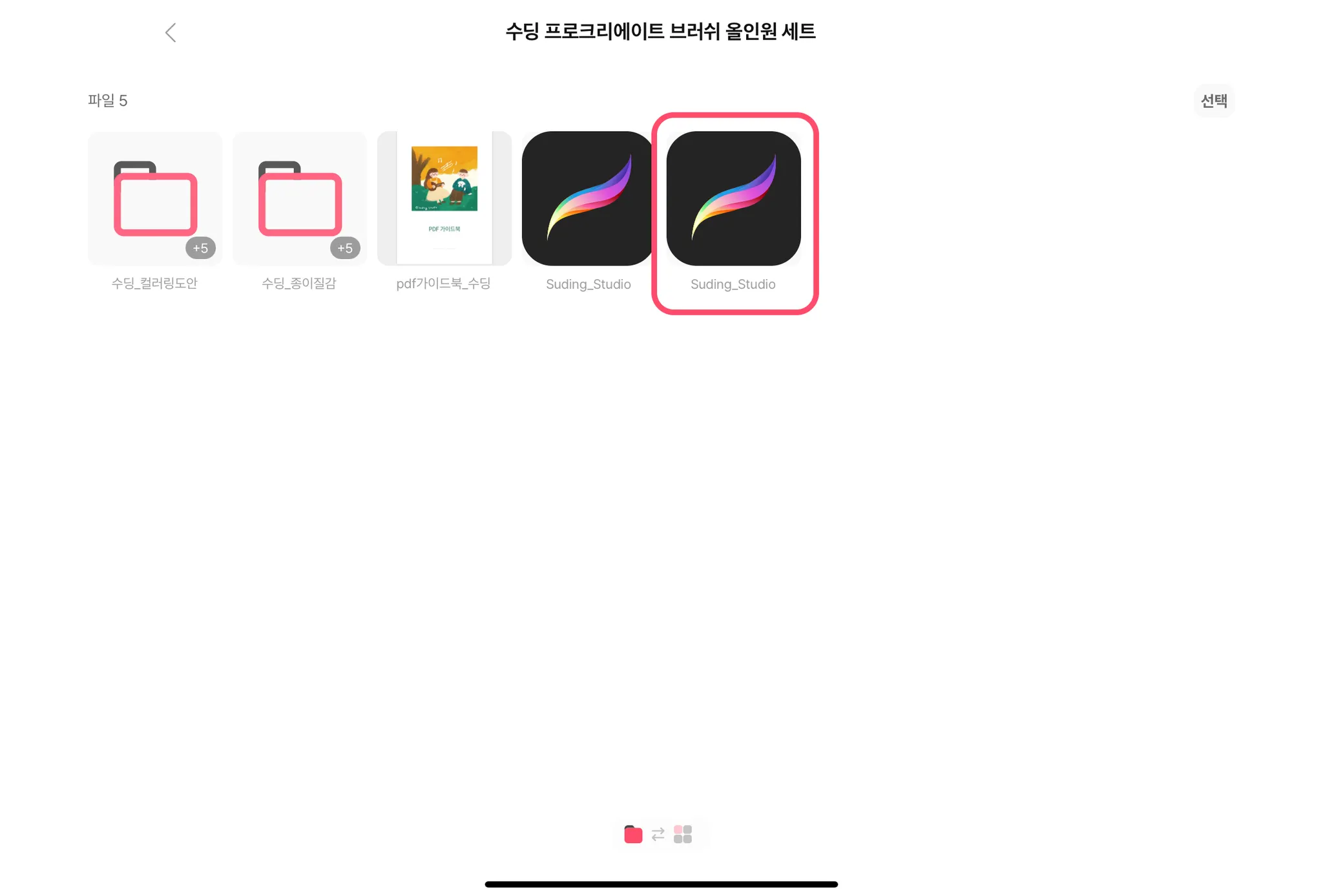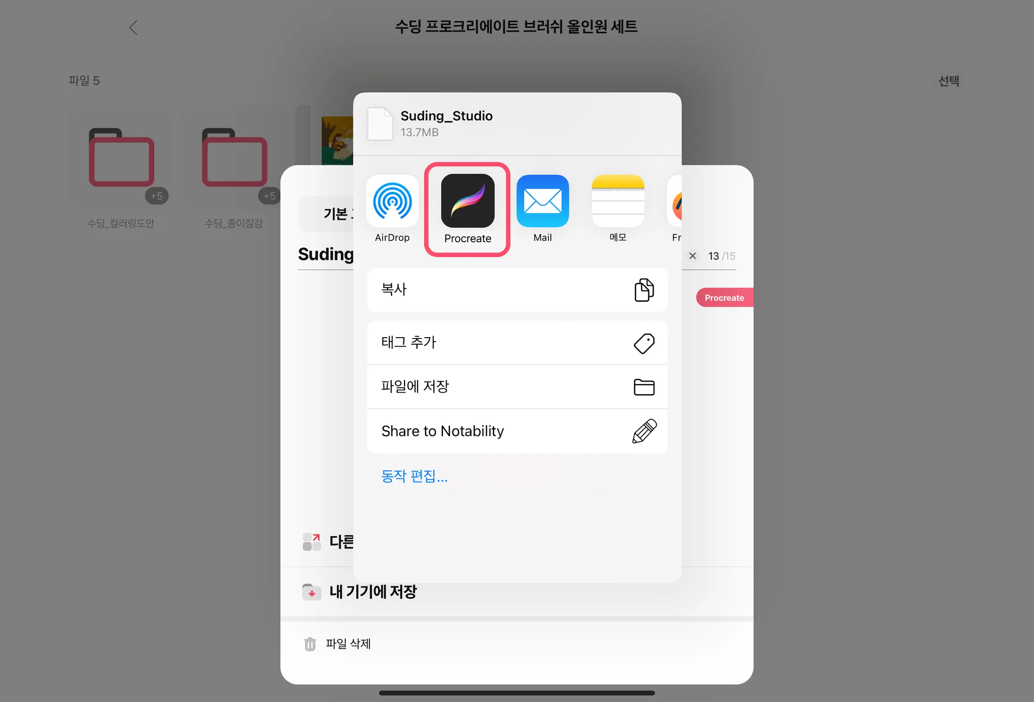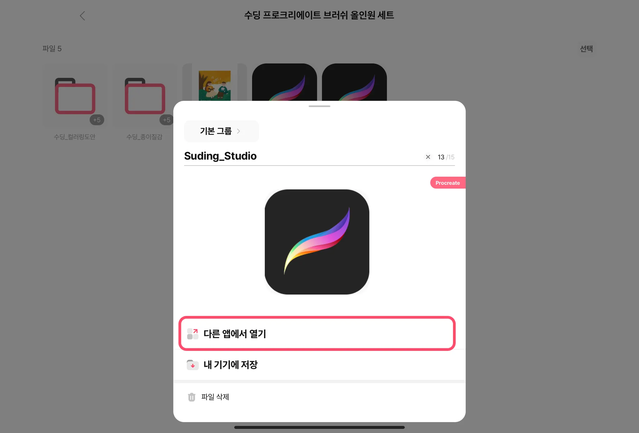 1. 프로크리에이트 전용 작품들은 앱과 동일한 아이콘으로 나타나요. 구매한 작품을 클릭한 뒤, [다른 앱에서 열기]에서 프로크리에이트 앱을 클릭해요.