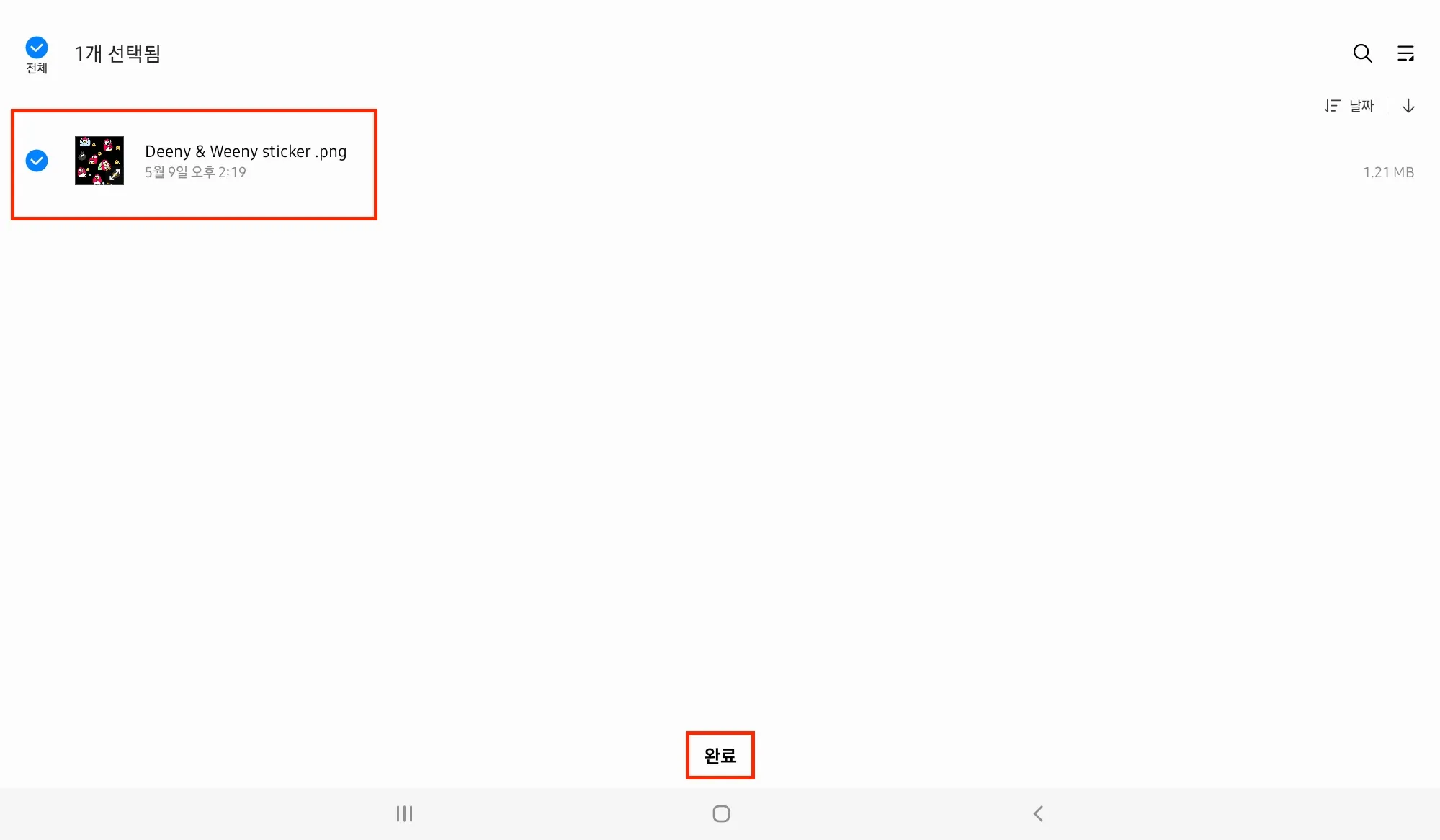 03. 스티커가 저장 된 폴더 선택 → 스티커 선택 → 완료