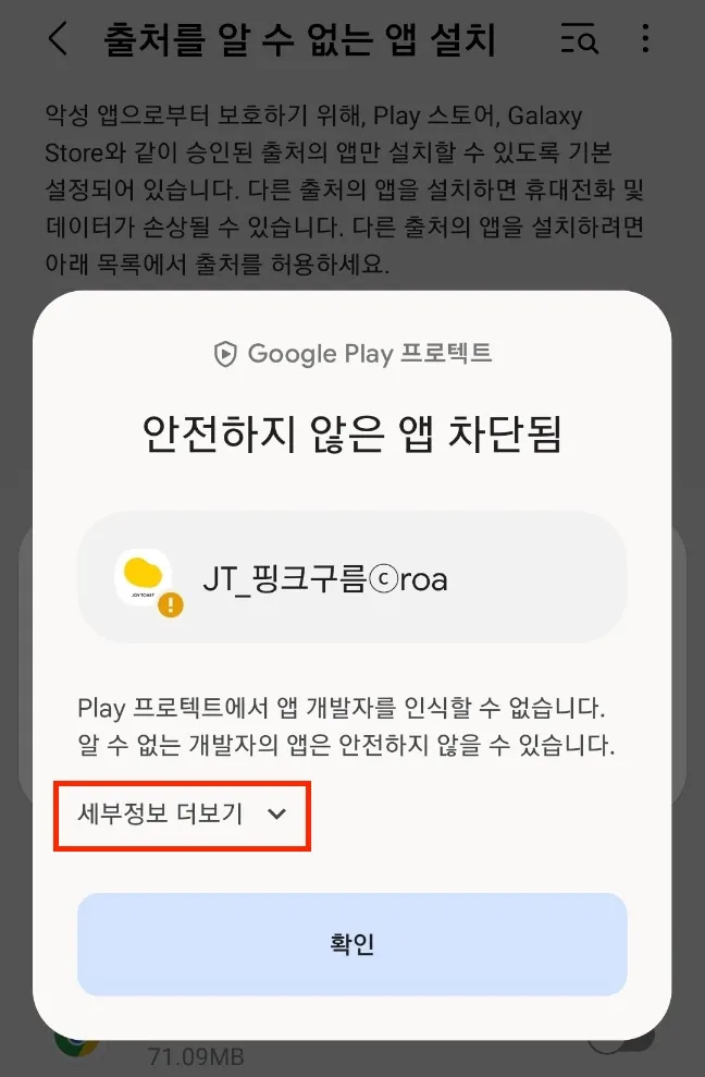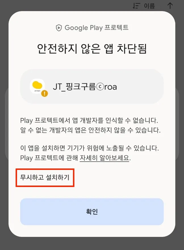 [안전하지 않은 앱 차단됨] 이라는 팝업이 떴을 경우, [세부정보 더보기] → [무시하고 설치하기]를 클릭해 계속 진행해요.
