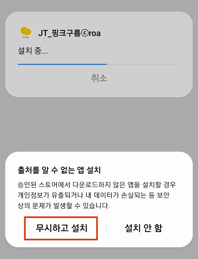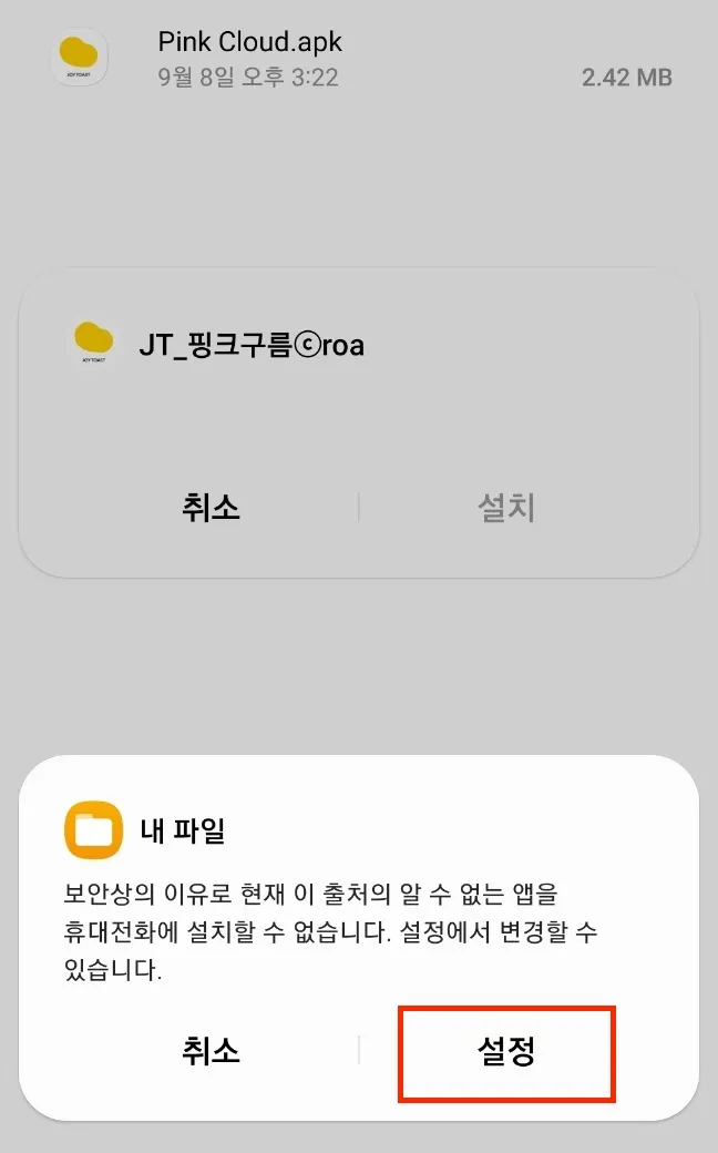 이 때, 출처가 알 수 없는 앱이라는 알림과 함께 설정 변경이 필요하다는 팝업창이 떴을 경우, [설정]에 들어가 권한을 설정해요.