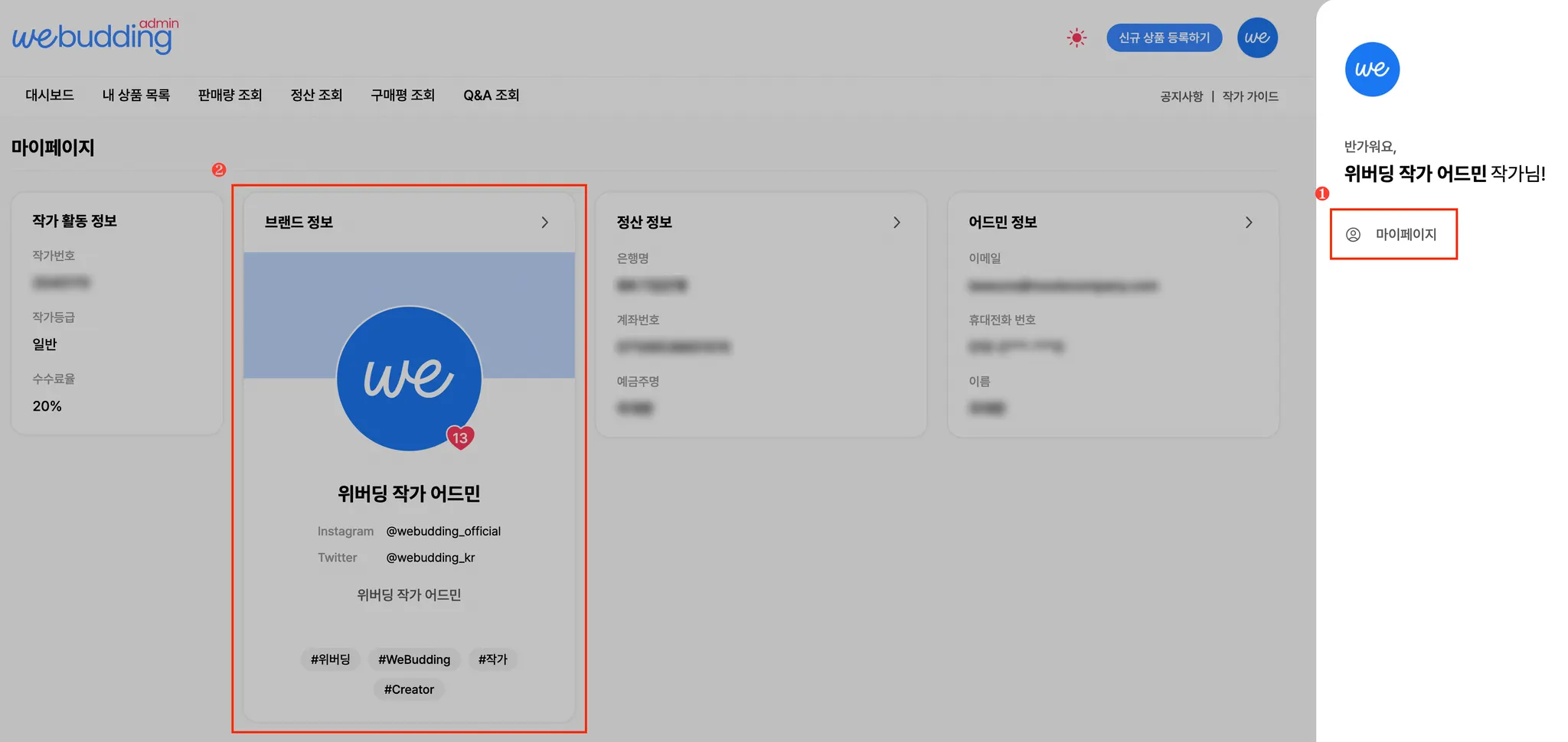 마이페이지 브랜드 정보를 통해서 별도의 문의 없이 작가님의 정보를 변경할 수 있습니다.
