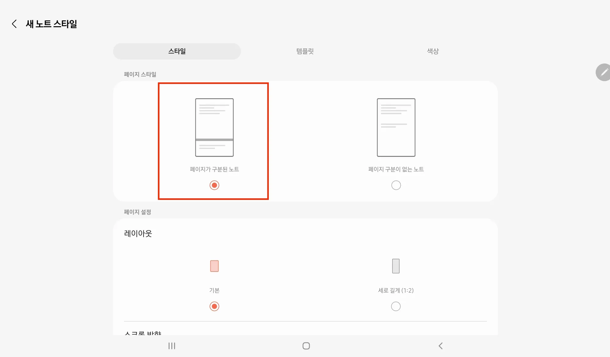 03. 새 노트 스타일 → ‘페이지 스타일’ [페이지가 구분된 노트] 설정
