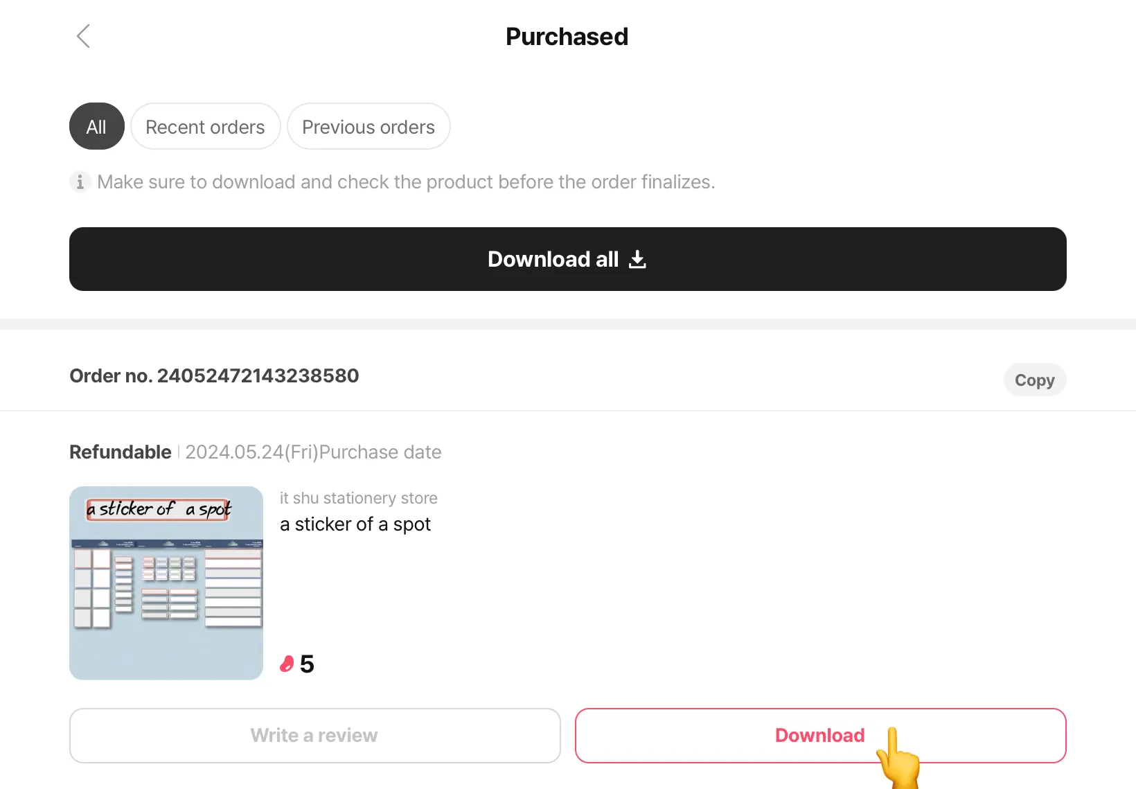 You can download purchased items any time after purchase. However, make sure to download and examine them within 72 hours if you would like to request a refund for defects.