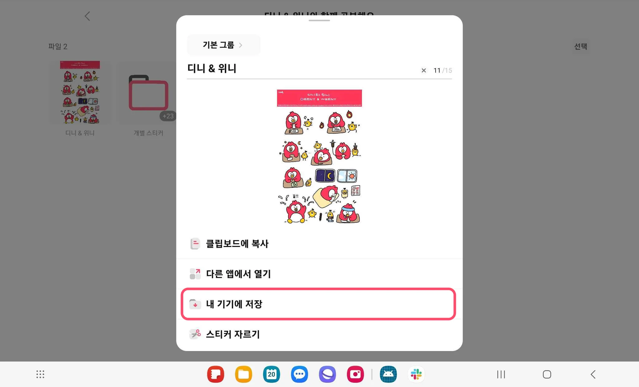 3. 위 방법이 정상적으로 이루어지지 않았을 경우, [내 기기에 저장]을 선택한 뒤, [파일] 앱에서 [다운로드] 폴더에 저장하여 사용할 수 있어요.
