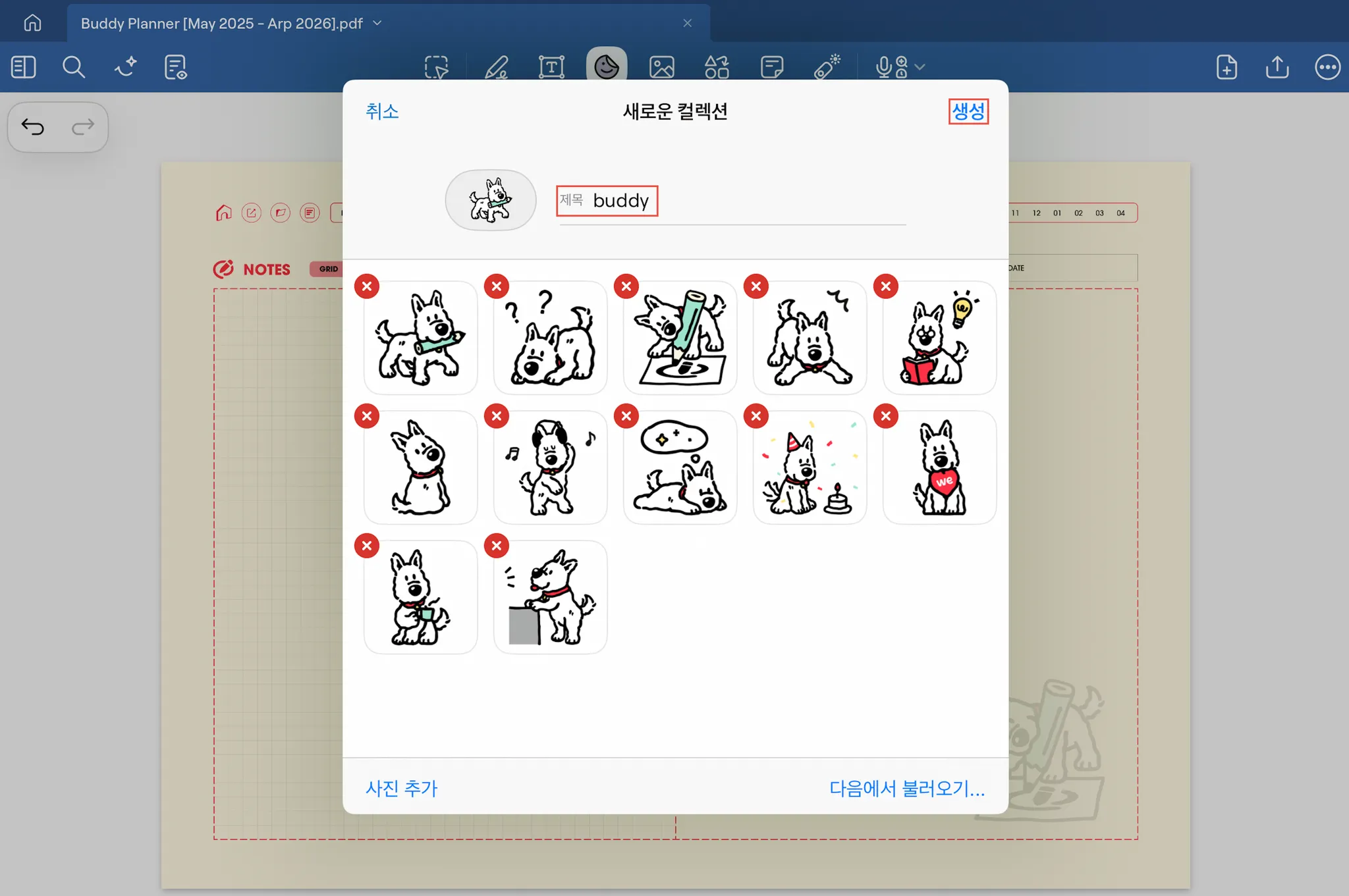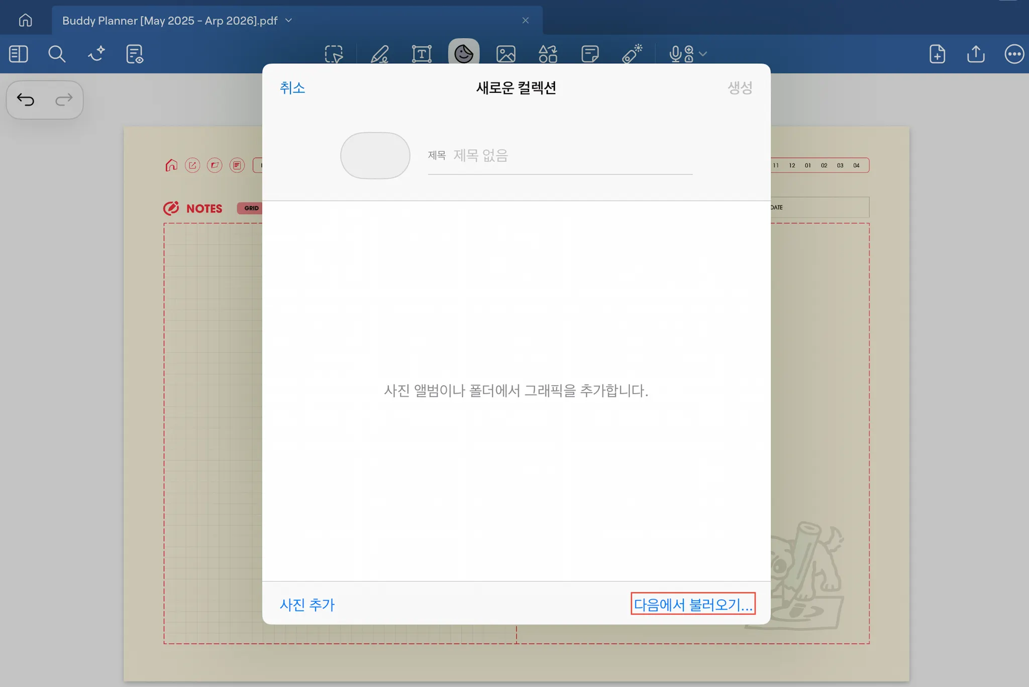 01. [스티커] → [콜랙션 추가] 버튼→ [다음에서 불러오기]