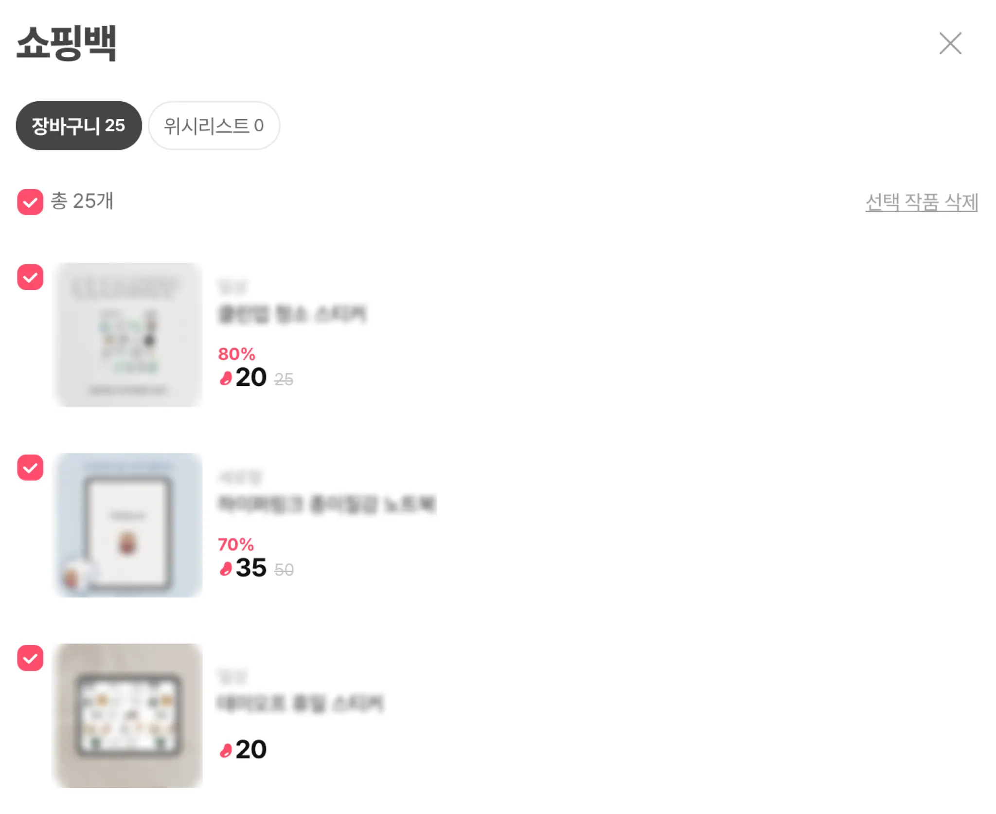 2. 쇼핑백에 원하는 작품을 골라 담은 후, 충전한 씨드로 결제해요.