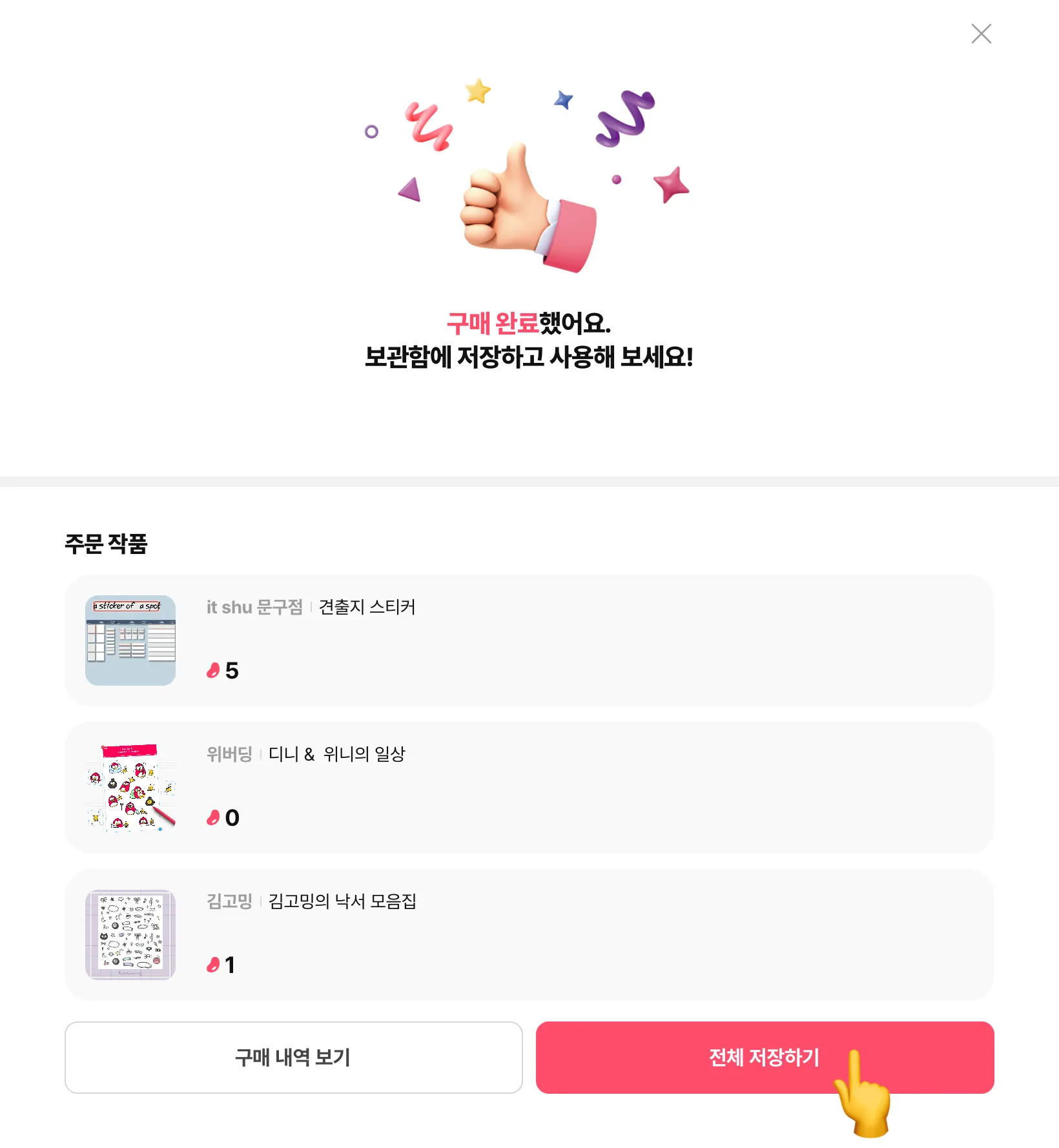 3. 결제 후 [구매 완료] 화면이 보여져요. 이 때, [전체 저장하기] 버튼을 클릭해 보관함에 저장하세요.