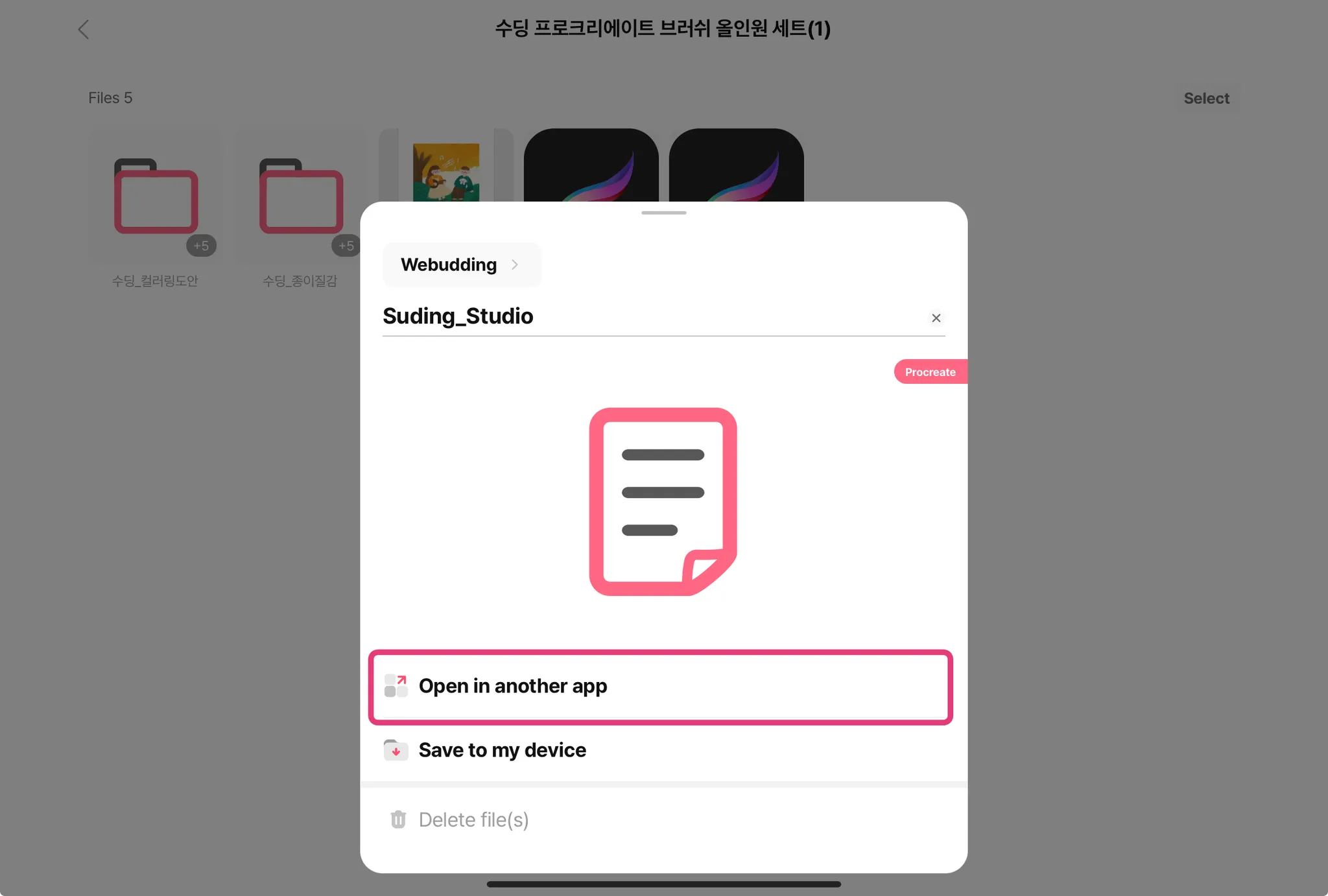 Procreate files use the Procreate app icon as thumbnails. Tap a file you would like to install, tap Open in Another App, then select Procreate.
